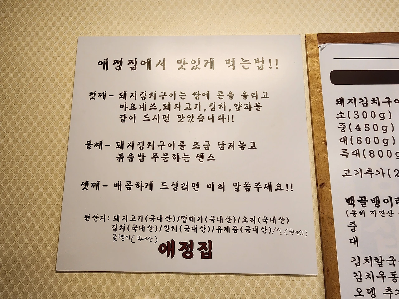 치즈가 들어간 폭탄계란찜이 무척이나 인상적이었던 애정집의 모든 재료 원산지는 국산이다. 돼지김치구이는 쌈에 콘을 올리고 마요네즈, 돼지고기, 김치, 양파를 같이 싸 먹는 요령까지 친절히 알려줘 더욱 인상적이었다. (사실 대화하느라 정신없어 이렇게 먹어보지 못해 아쉽다.)