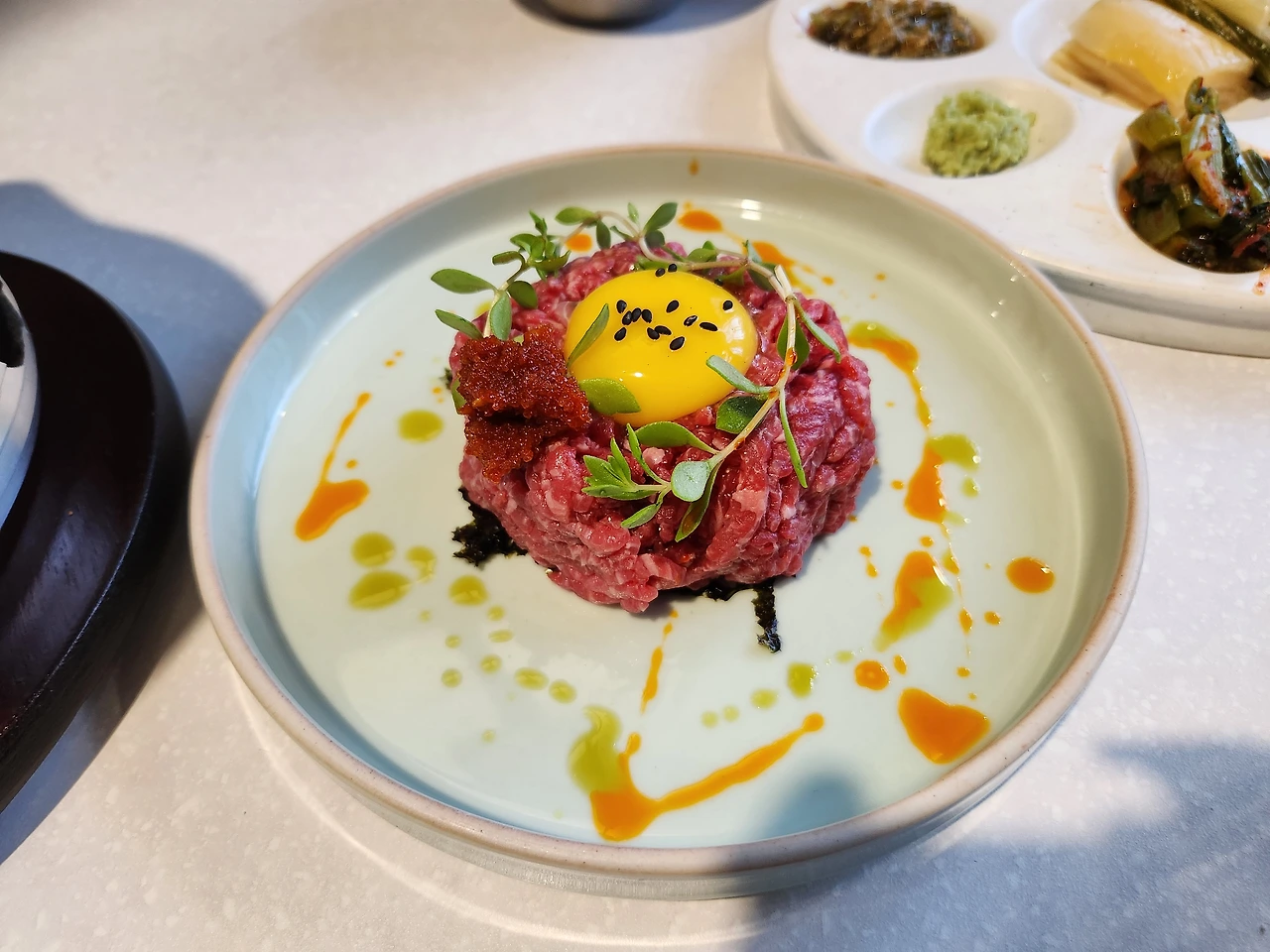 예사롭지 않은 산성식육점의 히든카드, 바로 한우 육회다. 일단 플레이팅에 한번 놀라고 맛에 두 번 놀란다. 청어알과 계란 노른자가 만나 입속 가득 팡팡 맛이 터진다. 맨 아래 김과 어우러진 맛 또한 신박하다. 육회를 김과 함께? 이 자체가 하나의 메인 요리라 해도 과언이 아니다.