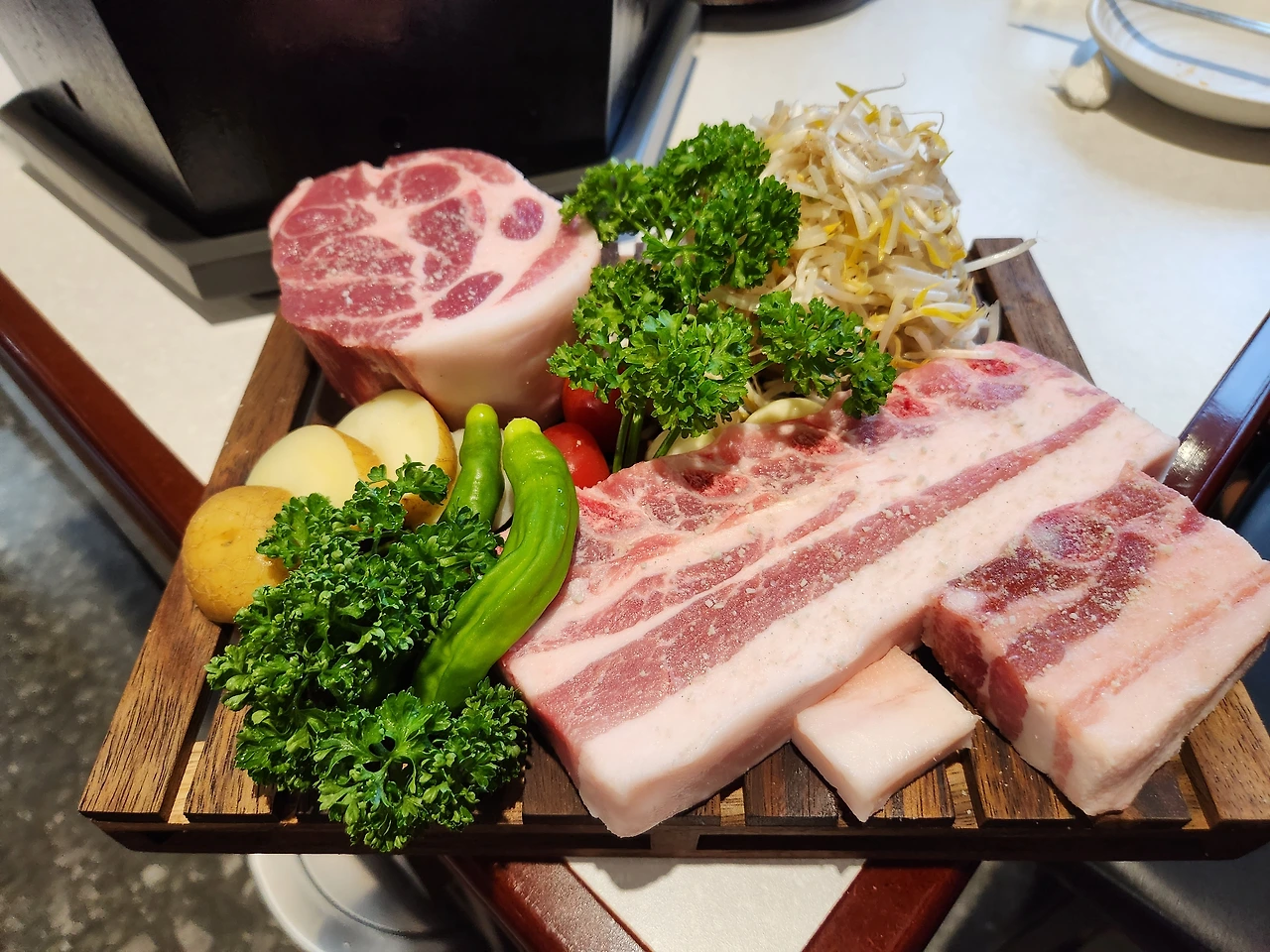 청어알, 갈치속젓, 기장미역소금, 갓김치 등 9가지 찬과 장이 담긴 구절판은 여전히 시선을 머무르게 한다. 아낌없이 담아져 내오는 정갈한 플레이팅에 여전히 합격! 요즘처럼 비싼 물가에 쌈 채소를 기대하기 어려운데 당귀까지 플레이팅 된 예쁜 쌈채소들을 보니 어느 하나 허투루 내오는 게 없는 산성식육점이다.