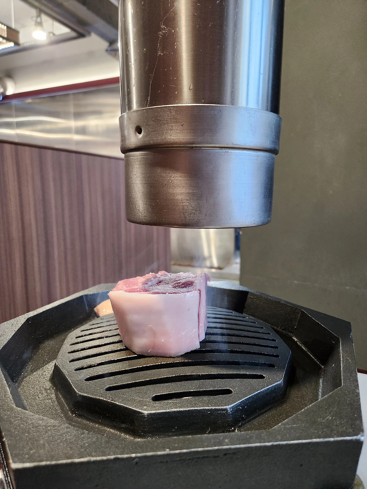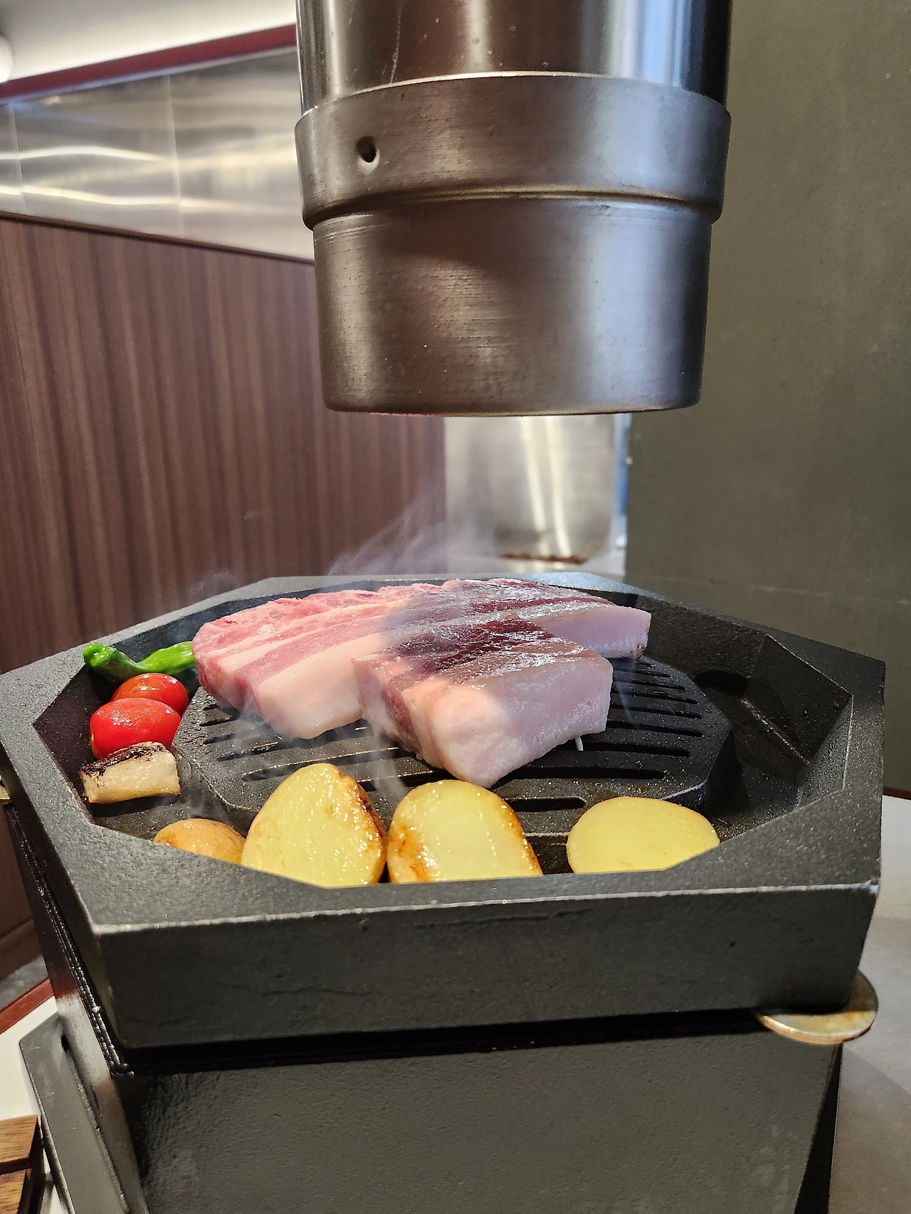 700g의 산성갈비와 꽃목살(72,000원)을 주문했다. 두툼한 목살이 자글자글 익어간다. 여전히 산상식육점만의 시그니처인 불판을 이용해 맛도 멋도 동시에 살렸다. 드디어 구워진 고기, 분명 돼지고기인데 소고기라 착각할 만큼 부드럽고 고소한 맛에 그만 대화를 멈춰버렸다.