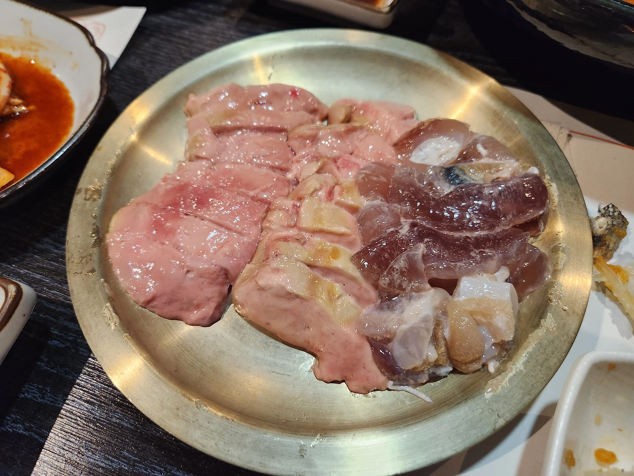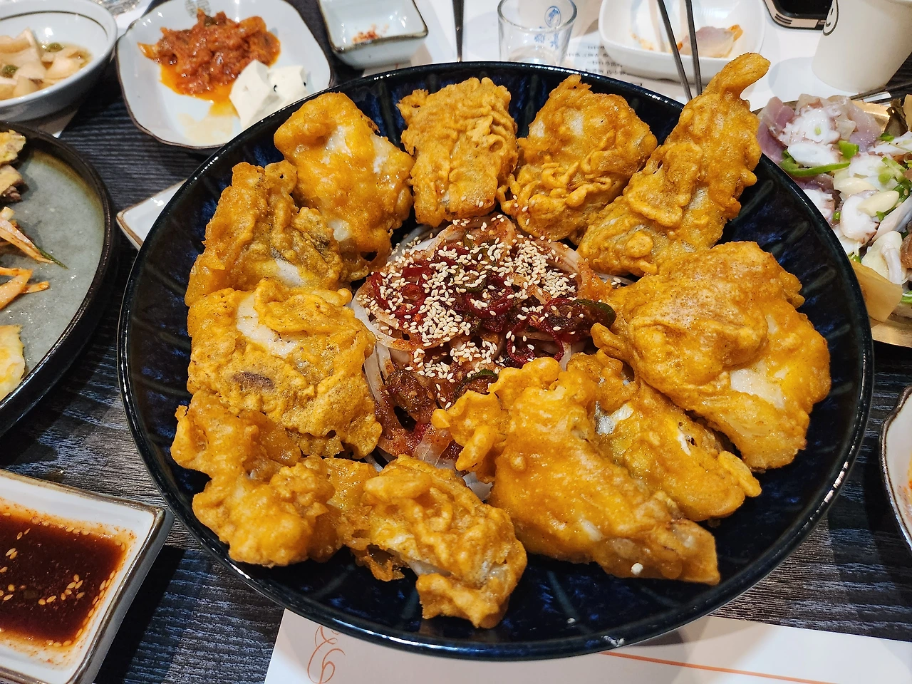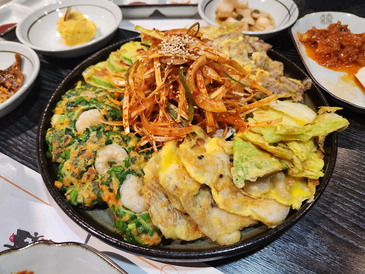 두 번째 안주는 30,000원의 모둠전. 모둠전 치고는 살짝 비싸지만 구성을 보면 고개가 끄덕여진다. 정성 들여 만든 새우부추전, 애호박전, 육전, 배추전, 동태전에 양파 겉절이가 요물이다. 전에 겉절이를 올려 먹으니 신박하기 이를 데 없다. 안동에서 먹었던 배추전과 비슷한 맛의 배추전 또한 그야말로 함양가의 손맛을 그대로 전해준다.