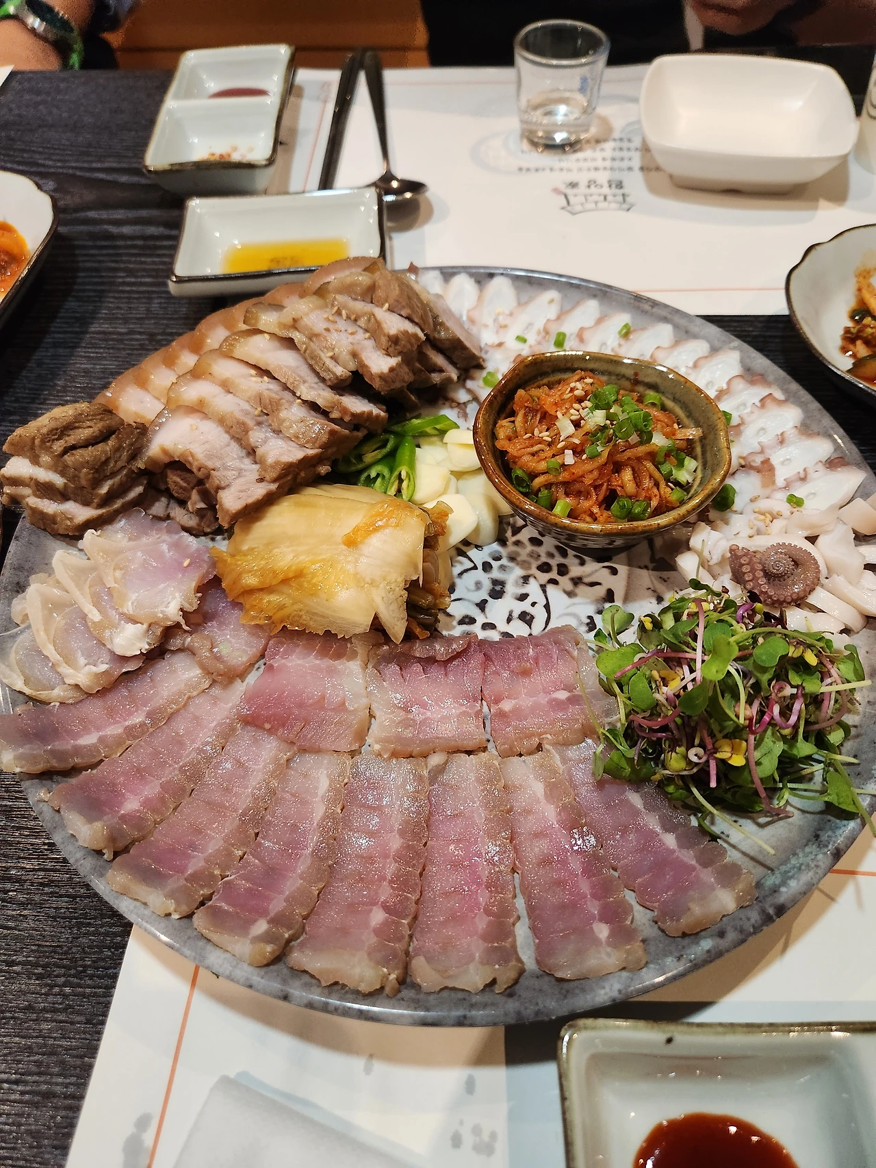 함양가의 저녁 안주 키워드는 수육, 홍어, 뭉터기, 육회, 일품전, 대구뽈튀김이다. 수육 + 홍어 + 문어 大자로 65,000의 첫 번째 안주를 주문했다. 홍어향이 확! 온다. 홍어를 좋아하지 않지만 한점 먹어보니 코뻥까지는 아니지만 삭은 향이 입안 가득 퍼진다. 홍어 좋아하는 분들이 젓가락질이 분주해졌다. 마침 중국에서 온 분이 가져온 술 한잔에 곁들이니 더없이 좋다. 수육도 부드러운 문어숙회도 아주 끝내준다.