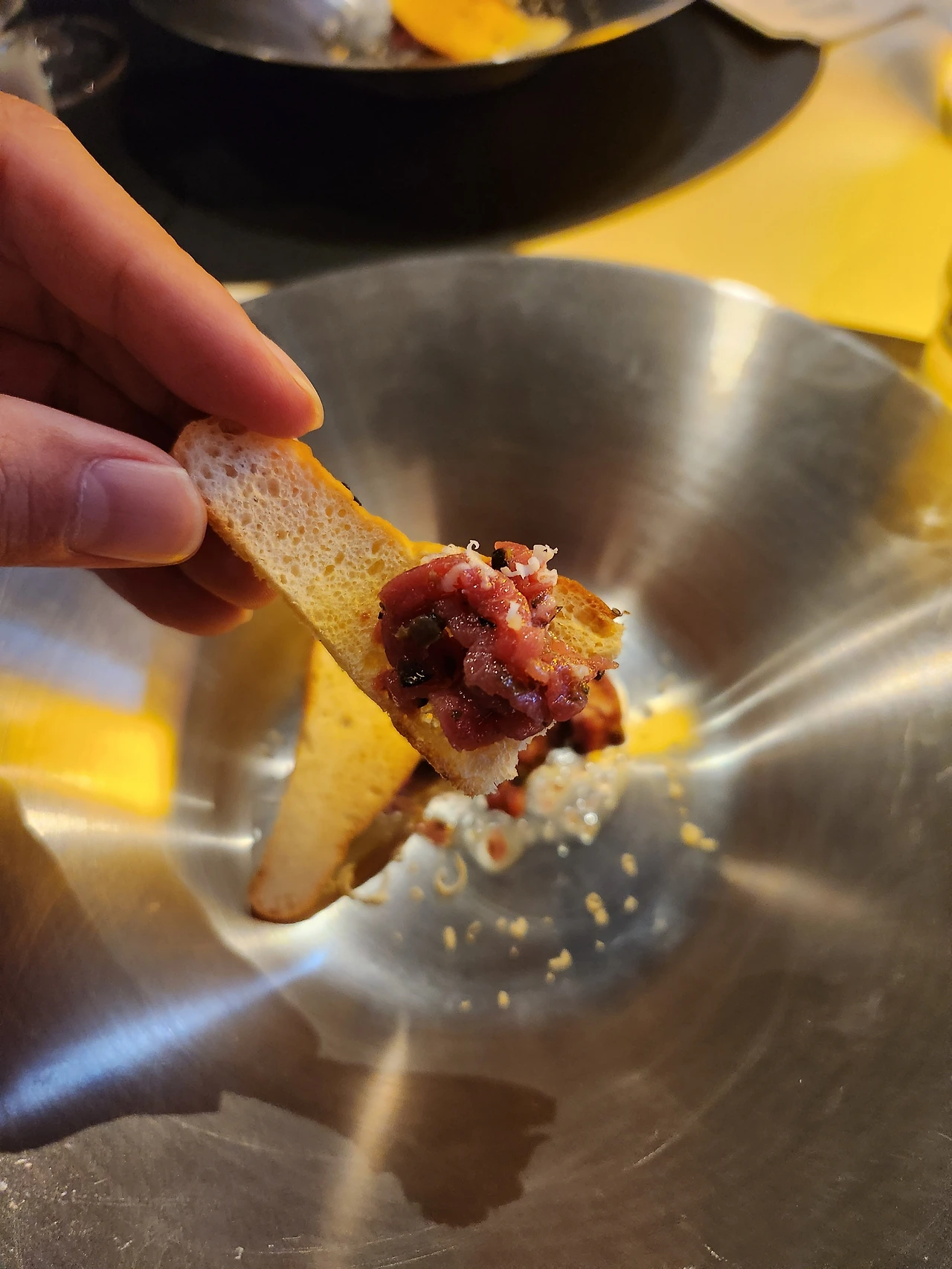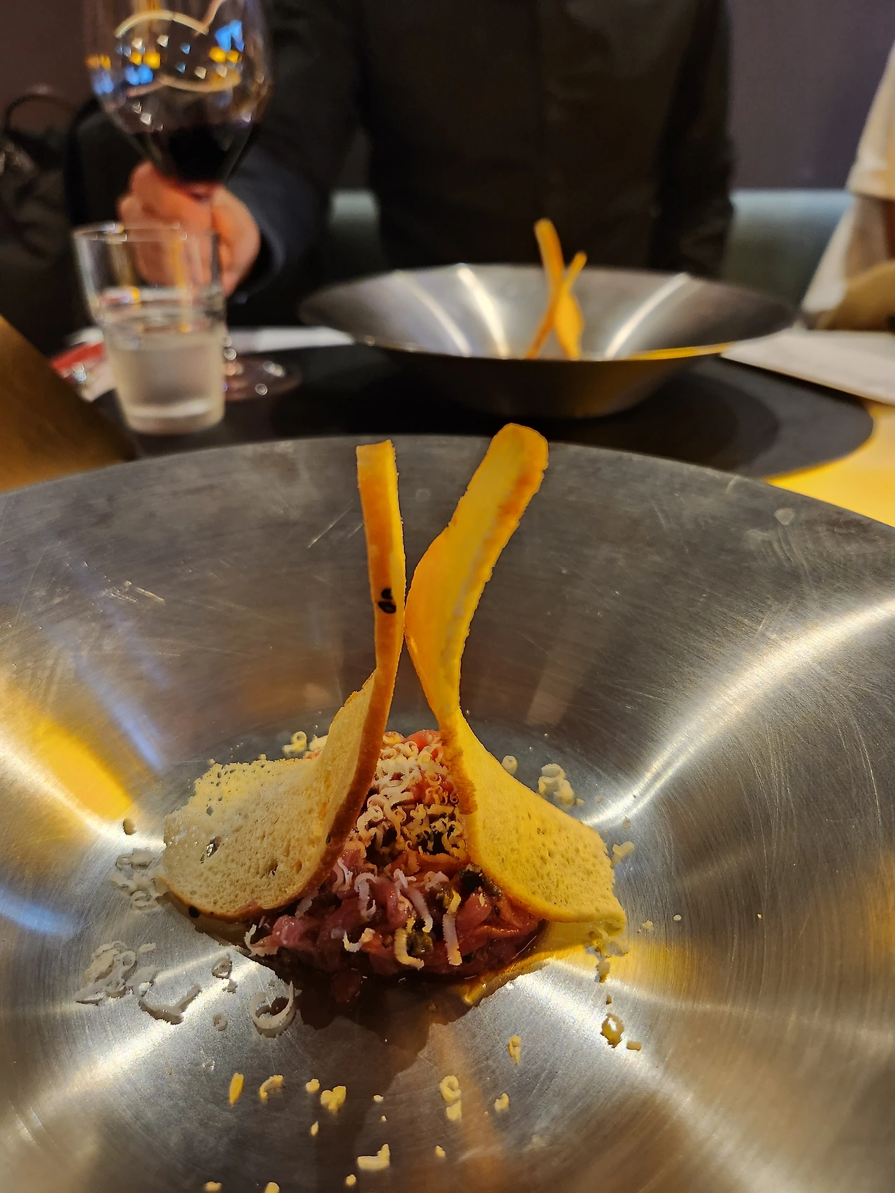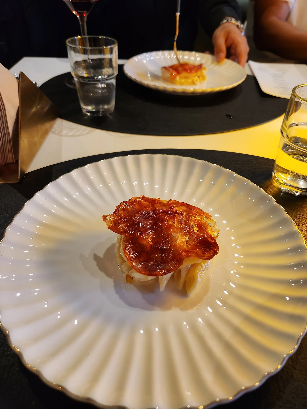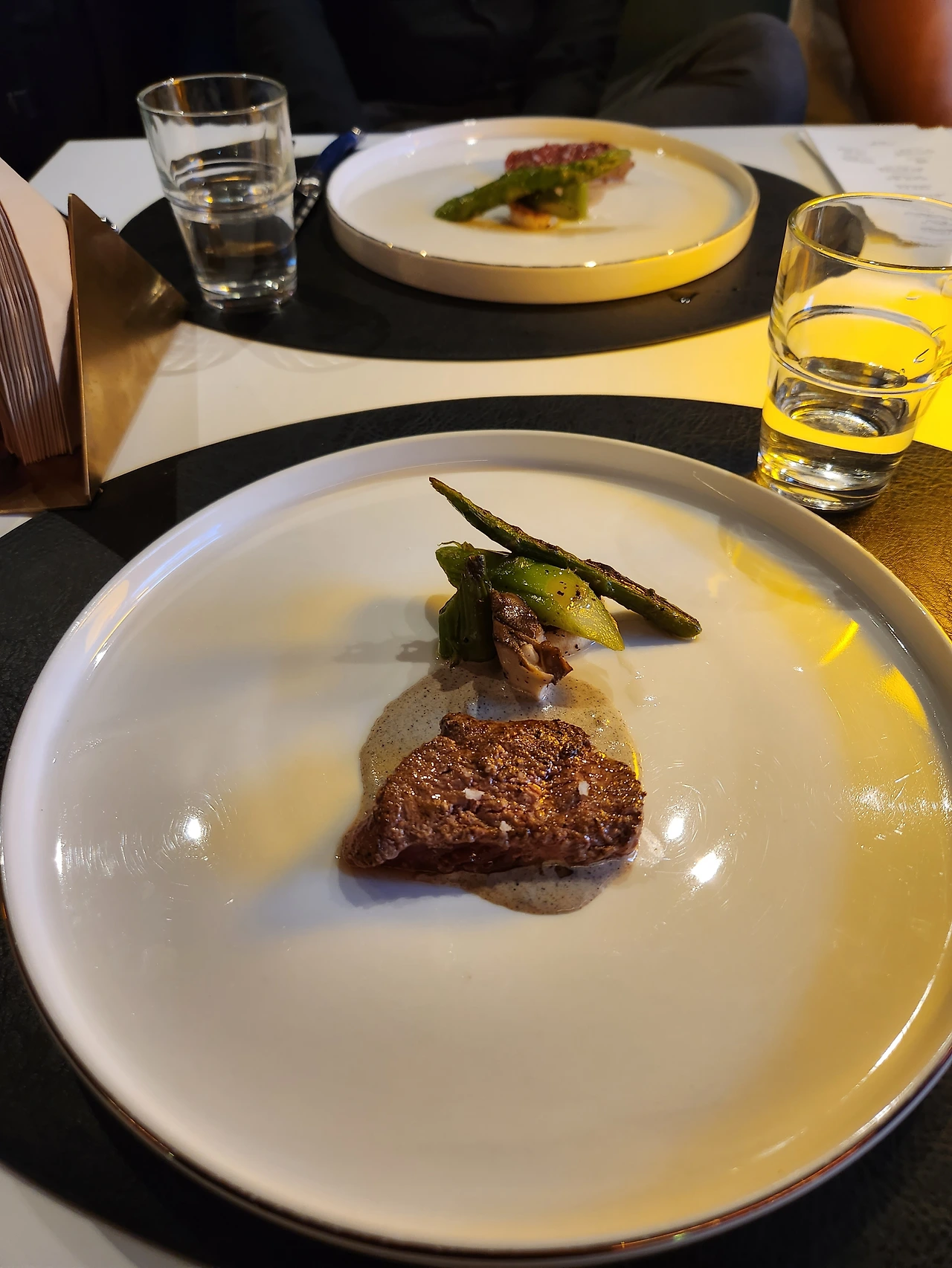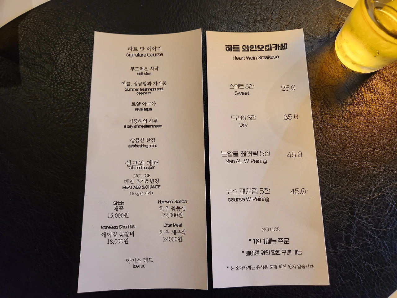 사실 메인인 스테이크 사이즈가 보통의 반 사이즈라 에게게? 했지만 이미 앞선 코스들로 배는 부른 상황. 고기에 진심인 사람들에게 살짝 아쉬울 수 있지만 나름 소식좌인 내겐 이마저도 배가 부른 딱 좋은 조합의 파인 다이닝 코스였다. (고기가 더 필요한 분들에겐 추가를 하면 스테이크의 중량을 높일 수 있다.) 요즘 물가에 디너 7코스가 49,000원이라니 그것도 놀랄 일인데 코스 퀄리티가 이 정도라면 말 다했다. 알리오올리오파스타는 무려 7,700원이라는 사실!