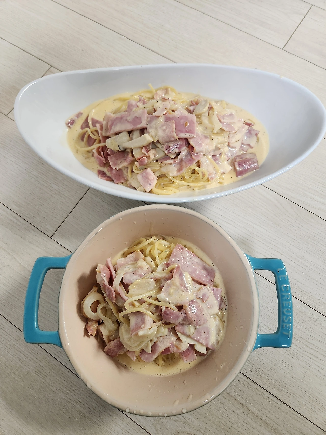아내와 아들이 2주일간의 방콕 여행을 마치고 돌아왔다. 2주 내내 썰렁했던 집에 모처럼 따뜻한 온기가 들어찼다. 주말 냉장고 있던 재료들을 꺼내 이것저것 해 먹다가 일요일 저녁 마침내 마침표를 찍는 요리가 필요했다. 유통기한이 임박한 베이컨과 햄. 이 둘을 좀 비주얼 좋게 맛있게 먹을 수 있는 게 뭘까? 하다가 무릎을 탁! 친 게 바로 파스타.