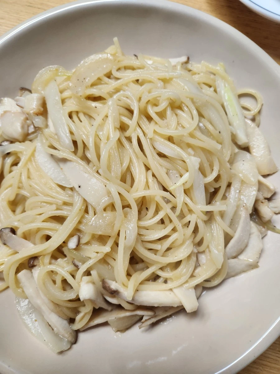 팬에 올리브유를 두르고 마늘(편으로 썰어도 되지만 다진 냉동 마늘도 좋음.)을 넣고 볶은 후 양파와 베이컨을 볶는다. 양파가 살짝 투명해지면 올리브유를 조금 더 넣은 후 면을 넣어 볶는다. 면수를 2 국자 정도 넣은 후 바작하게 볶아내며 소고기 가루 혹은 해산물 가루(치킨스톡 혹은 참치액젖이 있다면 좋지만 집에 잘 없으니)를 반스푼 넣어주고 소금과 후추로 간을 해 볶음을 마무리하면 끝. - 페퍼론치노를 보통 넣지만 우리 같은 맵찔이 가족에겐 전혀 필요 없는 재료!