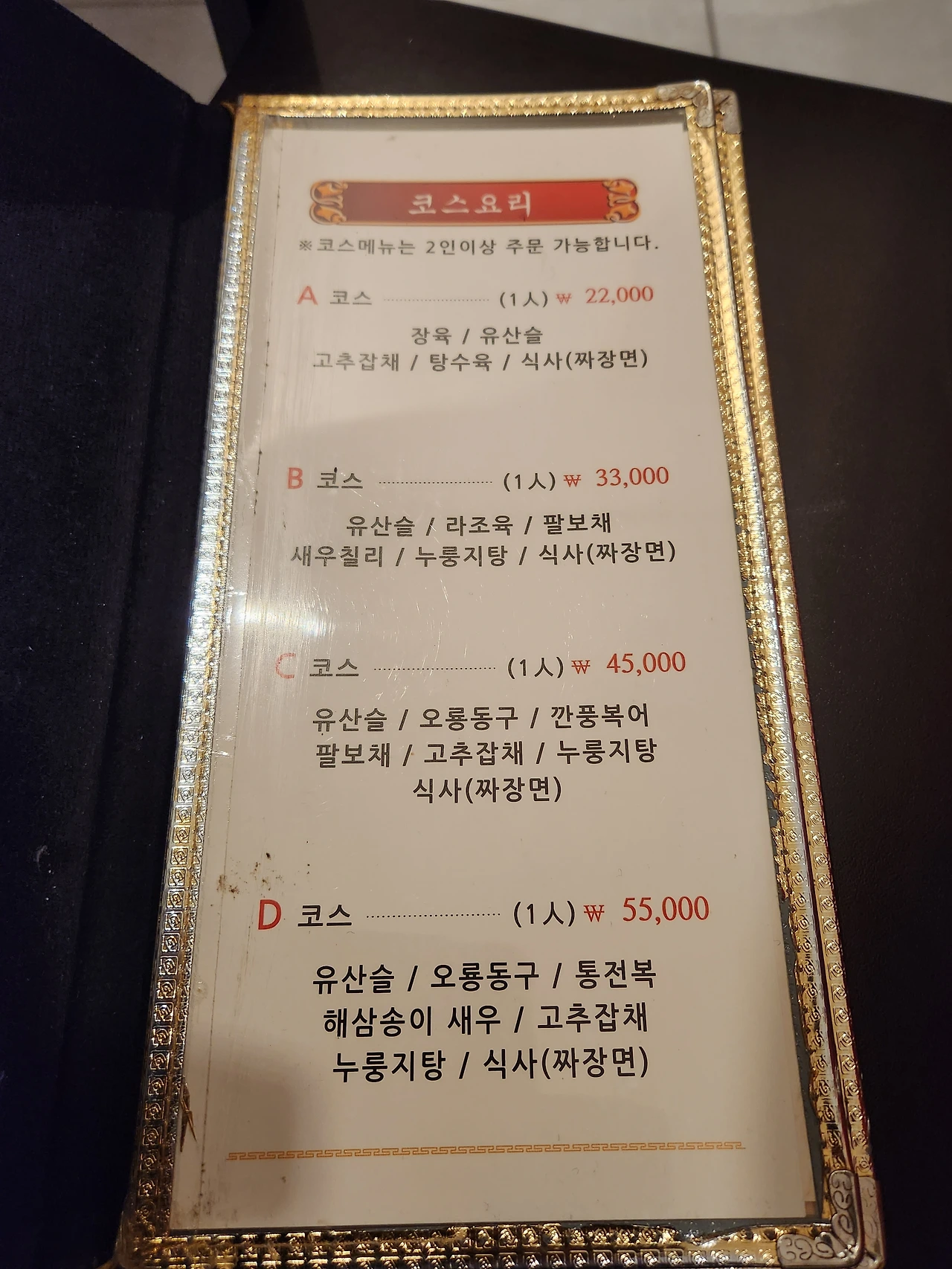 단품이나 간단한 요리하나에 식사를 곁들이던 점심에서 오늘은 소중한 분이 함께하는 특별한 자리라 코스 요리로 함께했다. 오룡동구, 깐풍복어의 2가지 스페셜한 메뉴가 있는 인당 45,000원 C코스. 유산슬, 오룡동구, 깐풍복어, 팔보채, 고추잡채, 누룽지탕, 짜장면의 7코스로 시작되었다.