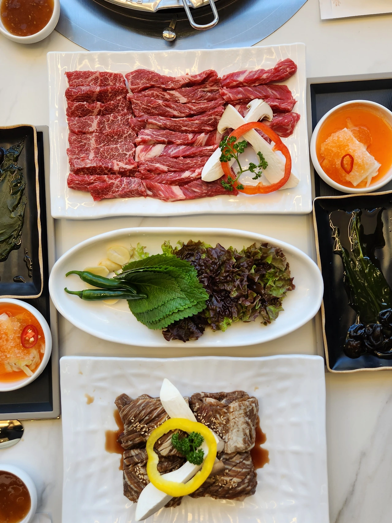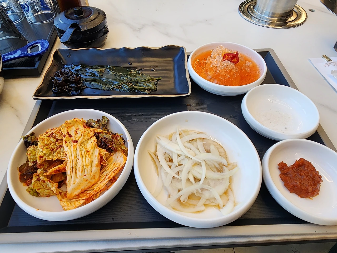 미국산과 한우가 크게 차이가 나지 않아 한우로 주문했다. 구이 3인분과 양념 2인분. 하필 전날 그다지 좋아하지 않는 양곱창과 고래고기를 1, 2차로 갔던 터라 속이 말이 아니었다. 고기를 구워주지는 않는 집이라 최고의 고기 전문가가 맛있게 구워내기 시작했다. 속이 안 좋아도 한 점은 먹어보라며 고기를 올려주는데 고기 냄새에 훅 받쳐 먹을 수가 없다.