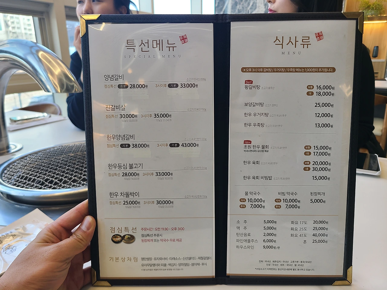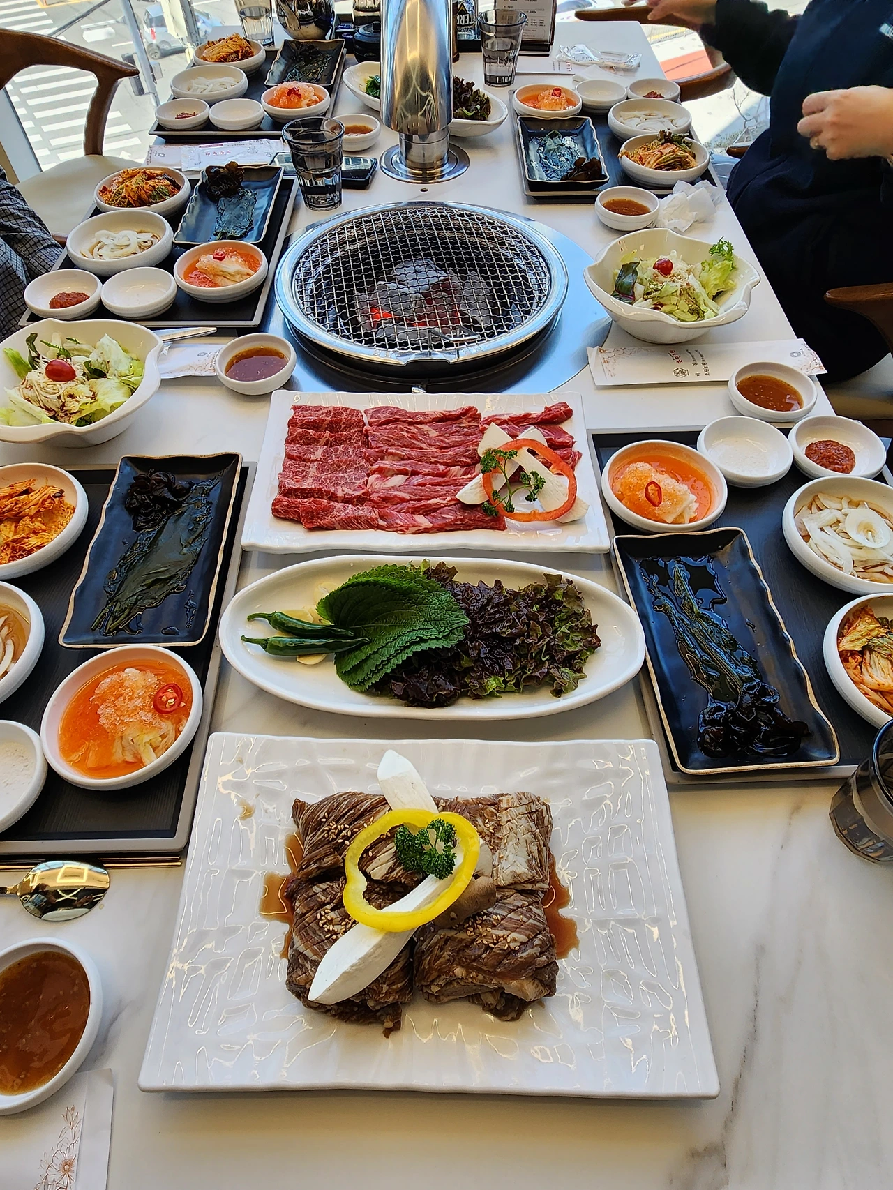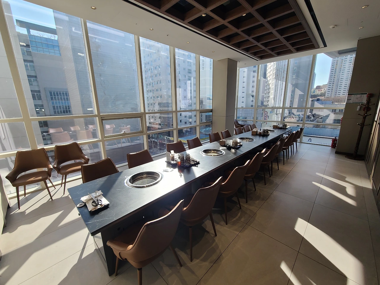 18명이 들어갈 룸을 보는데 와! 딱 이거다 싶다. 18석이 한 테이블로 되어 있고 2면이 시티뷰다. 룸마다 단체석, 모임 하기에 이만한 곳이 있을까 싶다. 식사비만 착하면 딱 좋겠는데 싶었는데 딱히 가성비가 있게 느껴지진 않는다. 다만 점심 특선으로 고기를 먹으면 식사비는 무료! 된장찌개와 막국수 중에 하나를 선택할 수 있다. 뭐 이 정도면 나쁘지 않네?