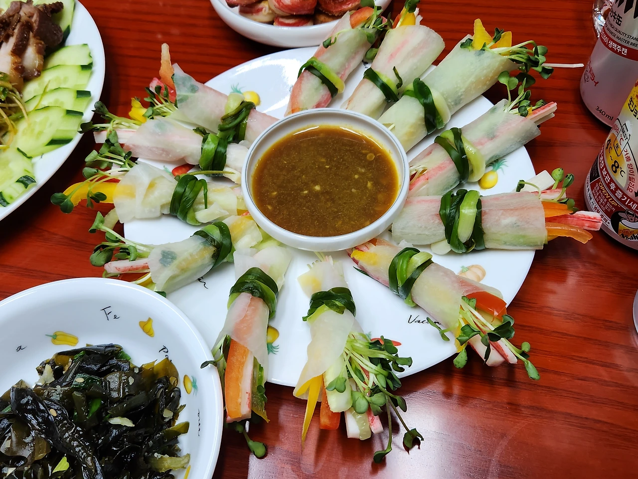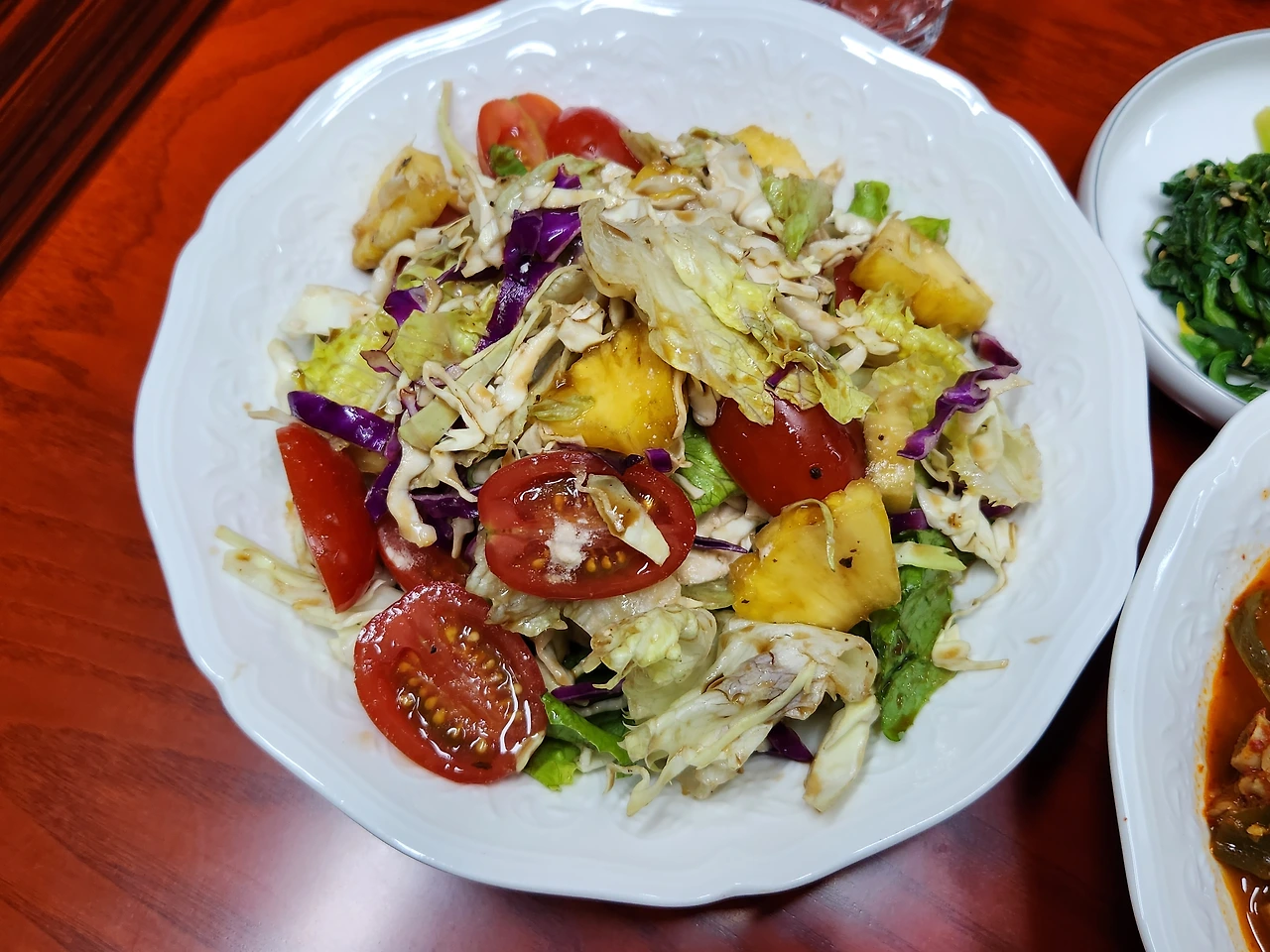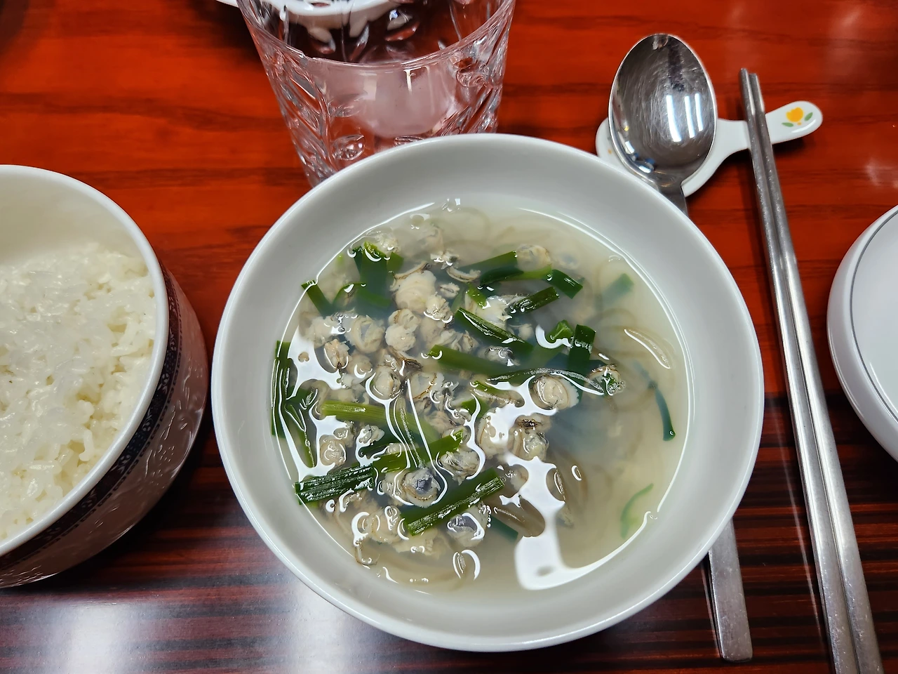 곳곳의 퇴직임원에 대한 글을 보면 조금은 우울한 면모가 없지 않은 요즘이다. 그래서 오늘 받은 이 맛있는 상은 퇴직임원인 그녀의 삶이 더욱 향기롭고 맛있다는 걸 단적으로 보여주는 고마운 상이다. 소스가 특히 기가 막히게 맛있는 오향장육, 짜지 않고 담백하면서도 맛있는 등뼈 김치찜, 손이 많이 가기로 유명한 야채 무말이(겨자 소스가 진짜 예술!), 맛살두부 하트전, 그리고 샐러드 2종까지. 이날의 이 밥상의 가장 하이라이트는 바로 채접국이었다. 살짝 매콤하면서도 당면이 어우러져 국이기보다 하나의 요리에 가까운 메뉴가 되었던 재첩국.