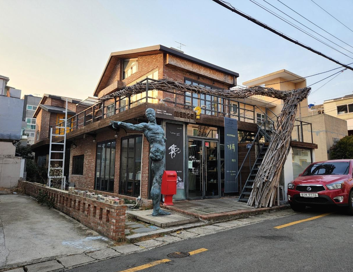 정식 명칭은 복합문화예술공간 MERGE? 에요. 머지라는 공간을 운영하기 전 2005년부터 부산 서구 꽃마을에서 국내외 예술가들의 레지던스를 위한 문화창작공간을 운영했죠. 13년 동안 공간 운영의 경험을 살려 예술공간 MERGE?를 개관했어요. 2016년 겨울 전시장을 먼저 개관하고 2017년 카페 공간까지 오픈해 그 해 5월 ‘13년 13인’ 전을 시작으로 매년 40여 회의 전시 및 문화 공연을 진행하고 있죠.