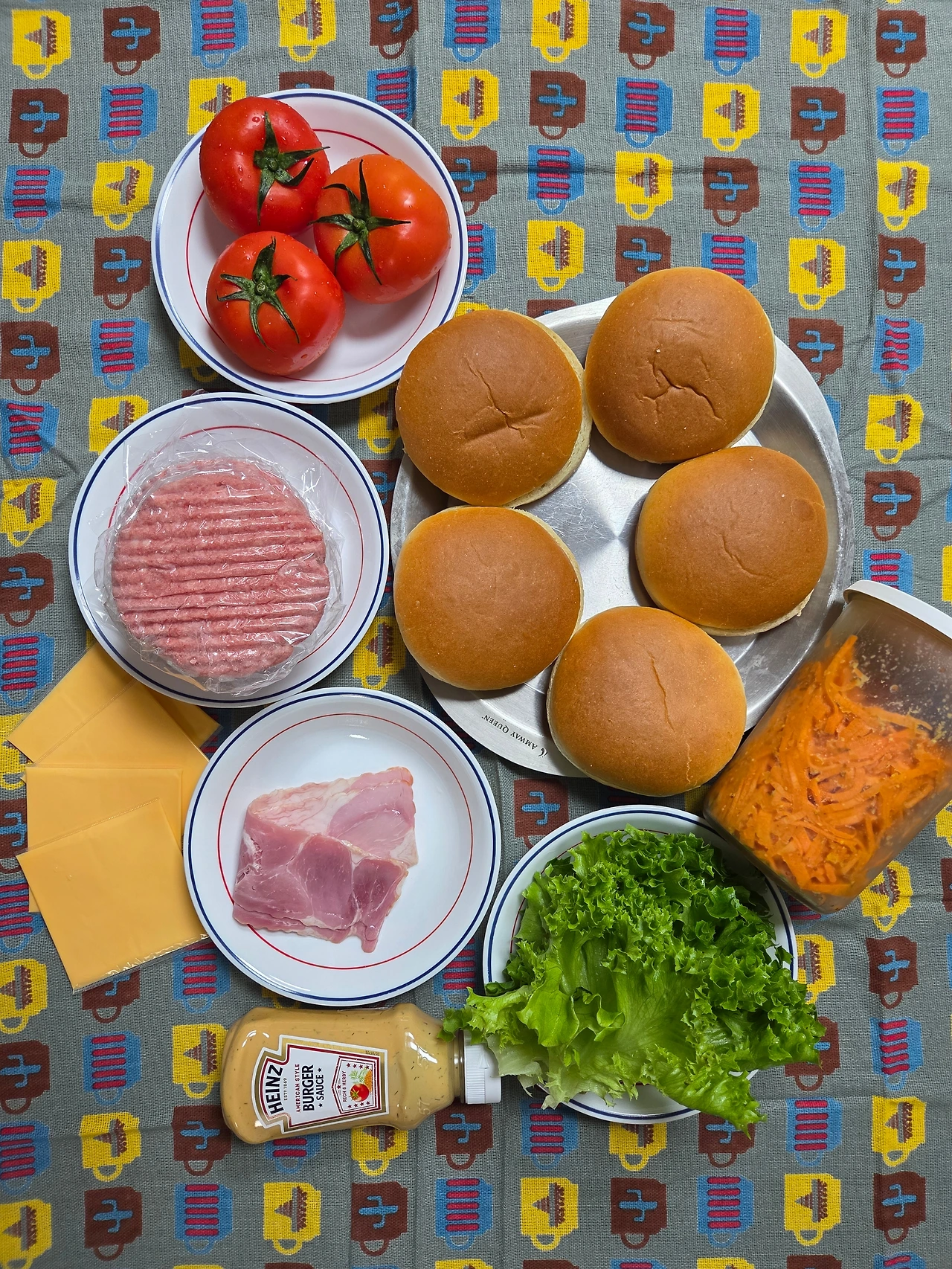 스마트팜으로 기른 유럽 상추(주문하면 생각보다 많은 양이라 나눠 먹고 아침마다 샐러드로 소분해서 먹기 딱 좋음.)를 먼저 준비해 놓고 햄버거 소스도 주문해 놓자. 먹다 남은 베이컨이 조금 있어 챙겨 놓고 토마토도 넉넉히 준비했다. 시판용 햄버거 빵(브리오슈로 준비)과 패티도 함께 주문했다.