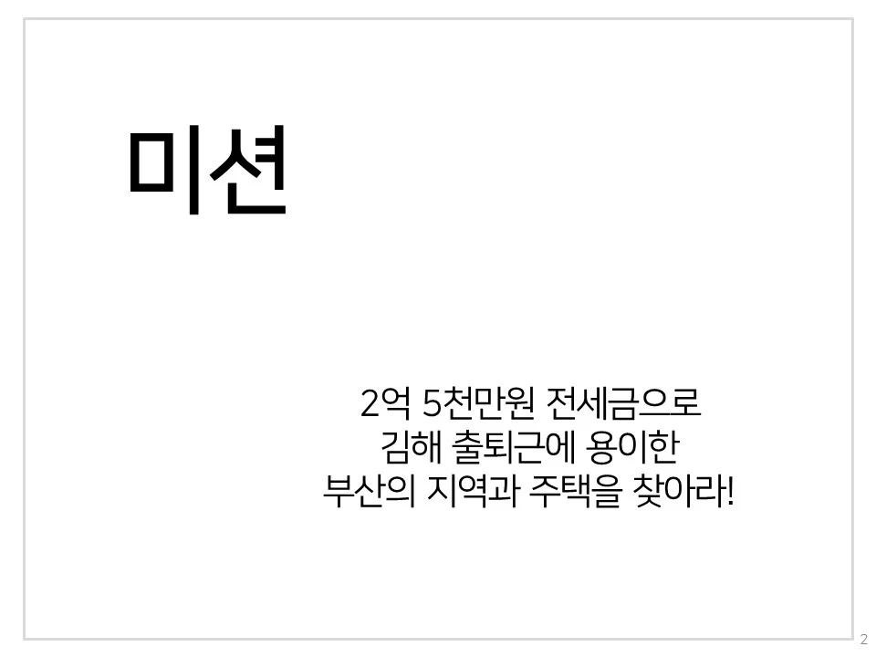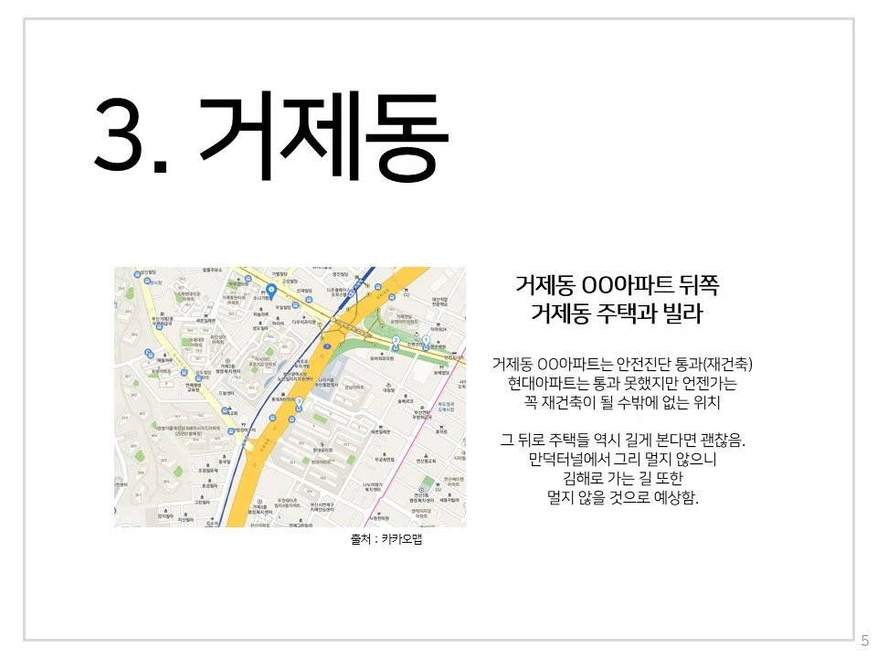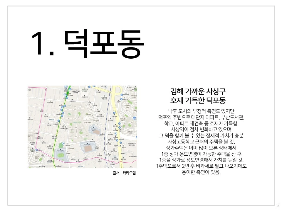 레버리지의 한도를 모르는 상황에서 추천을 해주기란 쉽지 않지만 젊음이라는 제대로 된 컨셉을 가지고 자료를 만들었다. 부산에서 김해를 출퇴근하는 신혼부부의 직주근접이 최대한 용이한 지역과 단순히 아파트만을 공략하기보다는 상가주택 등 향후 상승여력을 고려한 주택 형태도 같이 고려했다. 신혼부부라면 불편을 감수하고서라도 몸테크가 가능할 거라는 판단을 곁들였다. 작년 시점이라 지금과는 또 트렌드가 달라졌지만 참고할만한 부분이 있어 올려본다.