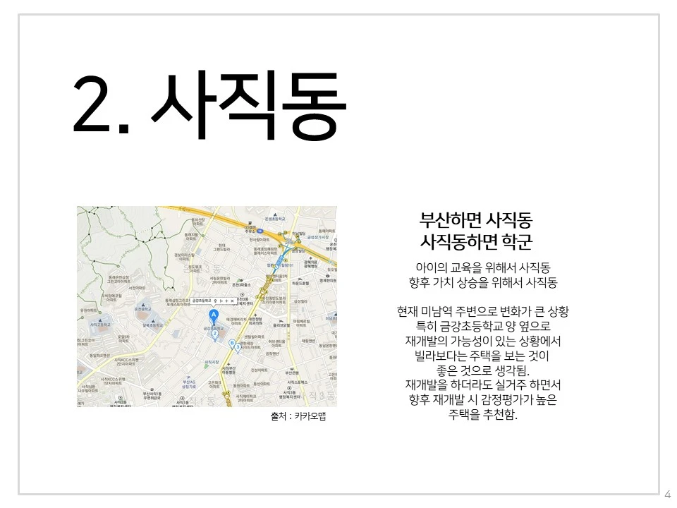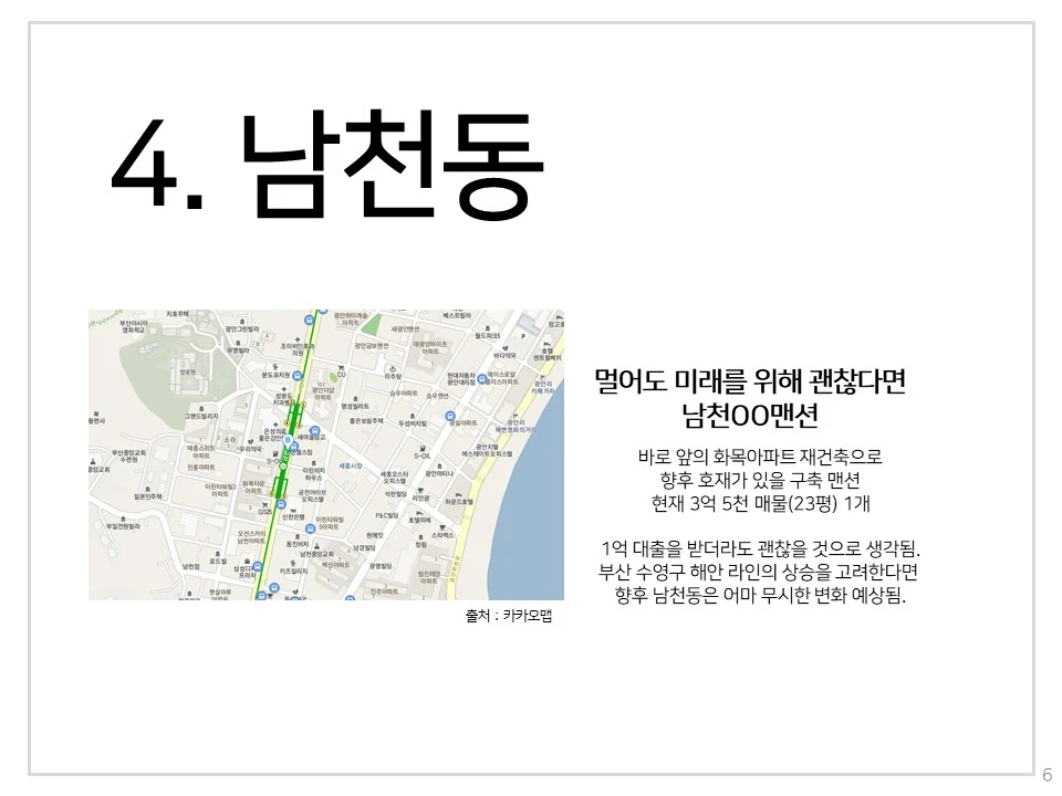 이런 제안을 해준 후 그는 부산 사직동의 구축 아파트 20평대를 매입해서 실거주하게 되었다. 사직동에 대한 추천을 했던 터라 잘했다고 물개 박수를 쳐줬지만 제안했던 그곳은 두 달 후 재개발 예정 지역으로 핫해지게 되었다. 빌라에 몸테크를 하기엔 부담이 있을 신혼부부였기에 그들의 선택을 응원한다.