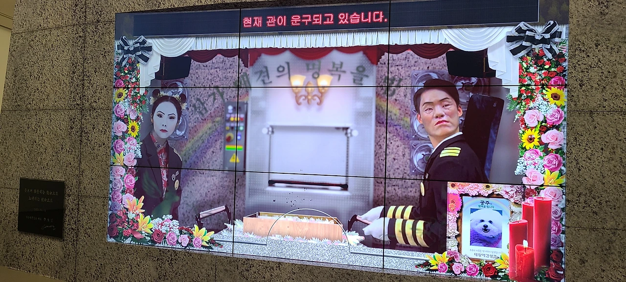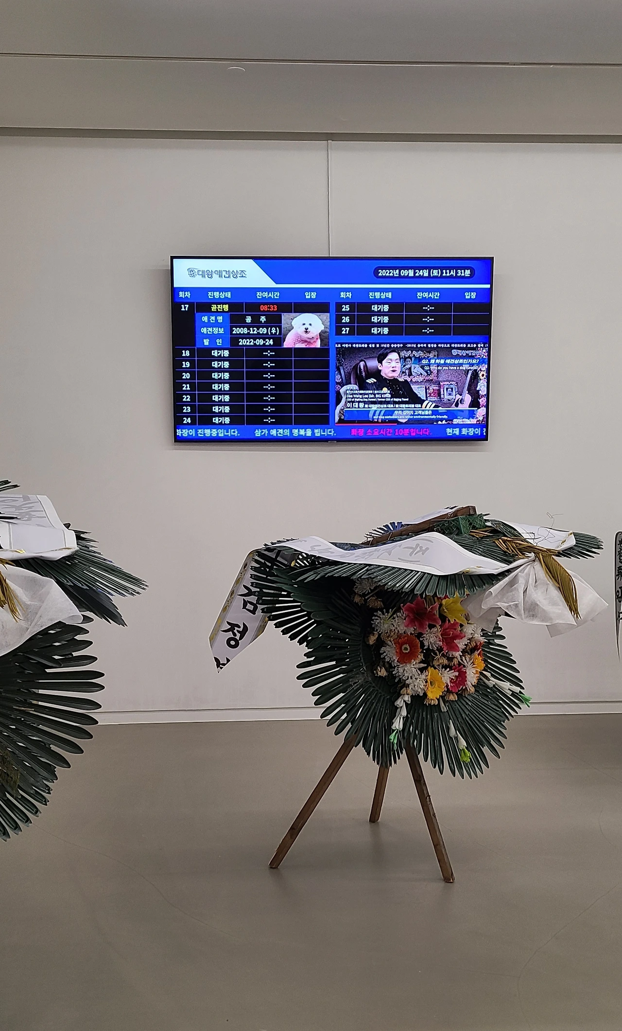 전시장 안에 들어서면 눈앞에 펼쳐진 풍경은 마치 하나의 거대한 화장터나 장례작장을 연상시키는 모습 입니다. 전시장은 대왕애견상조의 사업장으로 변신해 관객을 맞이합니다. 가장 먼저 보이는 작품은 우리가 화장터에서 흔히 볼 수 있는 화장 순서를 띄워 두는 모니터와 마치 고개를 숙이고 있는 듯한 화환들 입니다. 전시장 초입에서 관객들을 맞이하는 화환들은 우스꽝스러워 보이기도 합니다. 화환이라는 것 자체에 축하나 애도를 표하는 의미를 가지고 있습니다. 많은 사람들이 축하를 받을 사람 또는 애도를 표할 사람을 위한 예를 더하기 위해 사용되는 물건이 절까지 하고 있으니 어색하고 웃기기까지 합니다. 축하와 애도의 모습 보이지 않고 겉모습만 그럴싸한 비꼬는 모습처럼 보이기도 합니다. 화환들 뒤에 놓아진 모니터에는 공주라는 이름을 가진 애완견의 화장 순서를 알려주고 있습니다. 이는 전시장에 위치한 영상 작업과 연결되어 있습니다. 순서를 보고 영상의 내용을 예측해 볼 수 있다는 점에서 화장터와 같은 분위기가 더해집니다. 이 모니터에는 대왕애견상조의 대표 이대왕의 인터뷰가 끊임없이 흘러나오고 있습니다. 자신이 왜 이 사업을 하고 있는지 설명하고 자신은 많은 고객의 행복을 위해 노력한다고 주장합니다. 하지만 그 모습은 마치 사이비 종교가 사기적 행태를 감추고 정당성을 부여하기 위해 신도들을 세뇌하듯이 대왕애견상조를 방문하는 관객들을 현혹하기 위한 자기 포장처럼 느껴집니다. 얼굴을 딱딱하게 굳힌 채 입만 열심히 움직이는 이대왕의 얼굴은 말로는 뭘 못하냐는 듯한 생각이 드는 것에 신뢰성을 더합니다. 심지어 애견상조 사업의 효율이 좋다는 그의 발언은 반려동물을 사랑하는 많은 사람들의 가슴에 의심을 심어줄 겁니다.