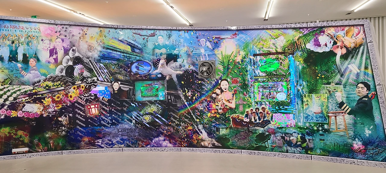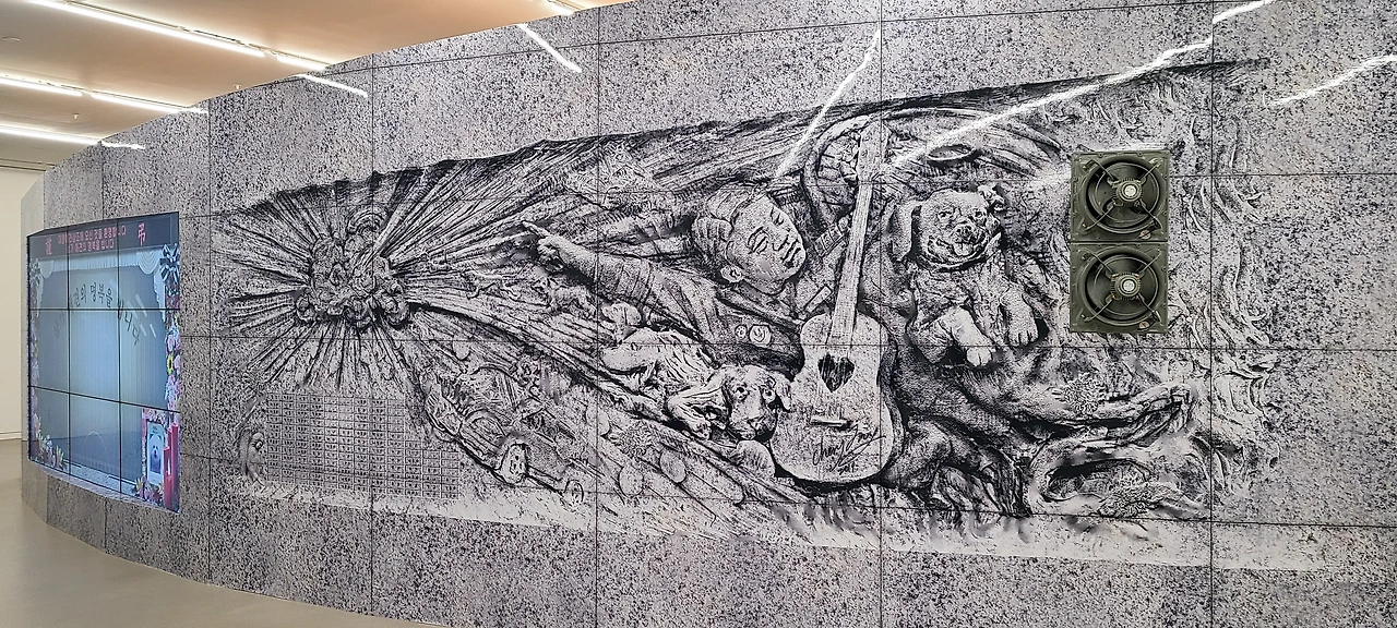 전시장의 한 가운데에는 거대한 대리석 벽이 공간을 가로질러 놓여 있습니다. 추모공원에서 보일 법한 이대왕과 애완견들의 모습은 대리석에 새겨진 것이 아닙니다. 부조처럼 보이도록 착시를 일으키는 이 그림 역시 이대왕의 인터뷰에서 느껴진 대왕애견상조라는 기업이 혹시 사기는 아닐까라는 의문에 빠지도록 합니다. 이대왕과 애완견들이 행복하게 무지개다리를 건너간다는 모습 그 자체가 단단하게 새겨진 것이 아니라 순식간에 지워질 수 있는 허상인 게 아닐지 의심하며 믿음이 얄팍해져만 갑니다. 착시부조 옆에 놓인 거대 모니터에는 사랑했던 애완견의 마지막모습과 무지개다리를 건너는 과정을 함께할 수 있도록 안내하고 있습니다. 전시의 제목인 <불타는 사랑의 노래>가 가장 잘 느껴지는 작품이라 할 수 있습니다. 10세의 나이로 사망한 공주를 애도하는 과정은 극단적인 모습을 보여주고 있습니다. 당황스러울 정도로 격렬하게 오열하는 공주의 주인과 생중계되는 공주가 무지개다리를 건너는 모습은 마치 우주선이 날아가는 과정처럼 보입니다. 이러한 과정을 마무리하는 이대왕의 트롯트같은 노래는 이 장소에 참석한 관객이 울어야할지 웃어야할지 알 수 없게 만들어 버립니다. 저는 반려동물이 존재하지 않기 때문에 또다른 가족을 잃은 심정을 상상하기 어렵습니다. 그럼에도 불구하고 이대왕이 제공하는 서비스는 극도로 과장되어 사이비 종교스럽습니다. 애도과정에서 공주가 계속 이야기하는 무지개 다리 너머는 좋은 곳이라는 이야기는 카더라에 기반하고 있기에 공주가 이대왕에게 속아넘어가 무지개다리를 건너는 듯 합니다. 이러한 모습을 지켜보며 기다리고 있으면 자신이 그쪽으로 가겠다는 주인의 과장스러운 태도는 슬픔에 잠겨 이성을 유지하지 못하고 함께 속은 듯한 모습으로 보이기도 합니다. 한발짝 떨어져 이 모든 행태를 관찰하는 과정은 강건너 불구경을 하거나, 막장드라마를 보는 듯한 느낌이 듭니다.