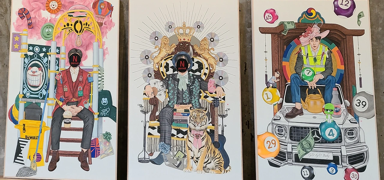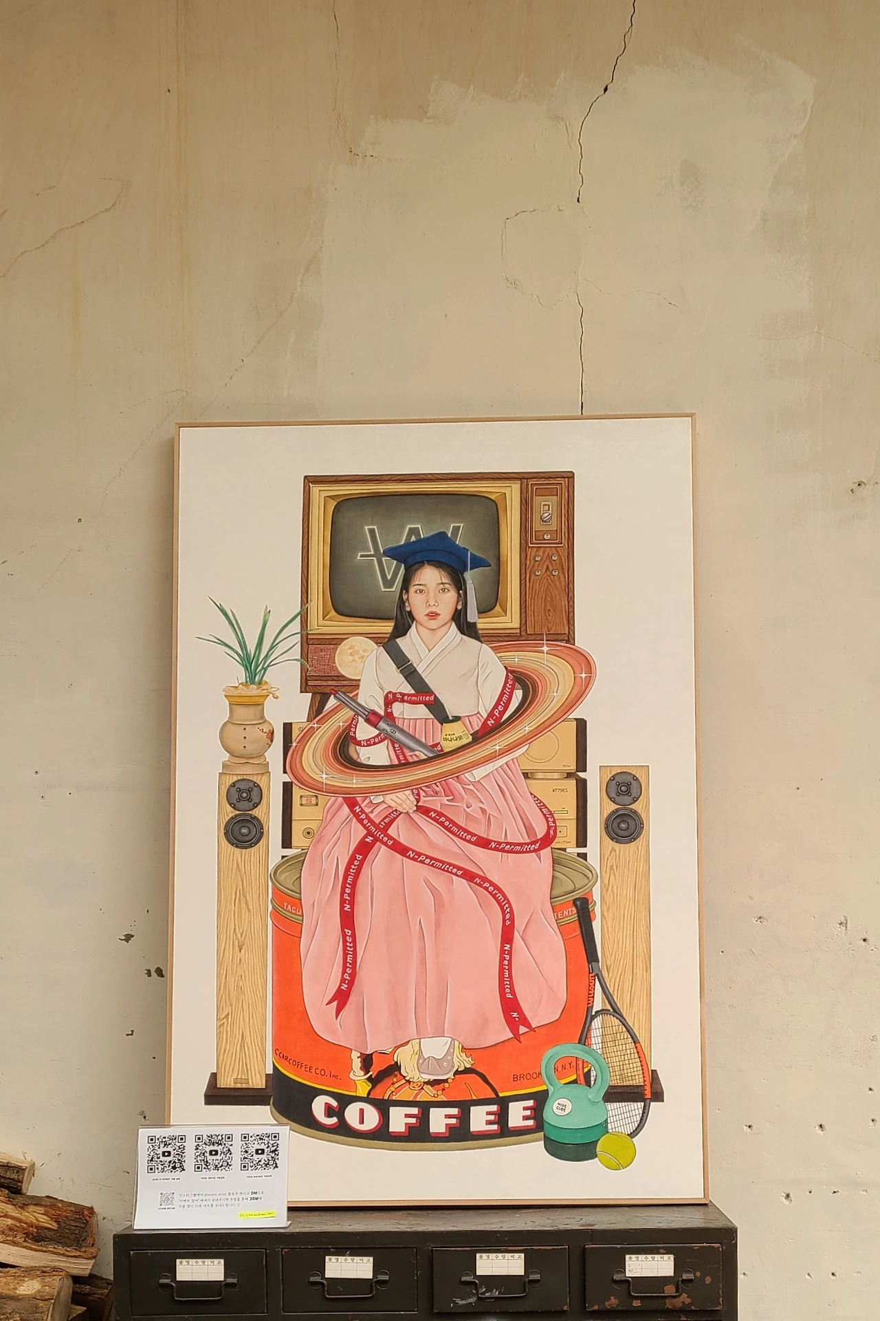 안서진 작가가 그려낸 대중문화의 아이콘, K-POP을 대표하는 아이돌들은 화려한 건물 앞, 왕좌, 벤츠 또는 커피캔과 같은 다양한 물체에 다양한 모습으로 앉아 있습니다. 탱화에서 발견할 수 있는 부처의 가부좌 자세나 조선시대 초상화에서 발견할 수 있는 모습으로 앉아있는 이들의 모습은 마치 수많은 사람들의 선망의 대상으로써 우상화된 것처럼 보입니다. 현대에 이르러 새로운 우상의 위치를 차지한 연예인들은 그들이 원하던, 원하지 않던 수많은 눈길에 얽매여 생활하게 된다는 지점을 과거 왕이나 부처를 그렸던 도상을 통해서 이야기합니다. 아이돌이 그려진 화면에는 테니스, 난초 화분, 캐릭터 둘리와 고길동, 대걸레와 같은 물건들로 가득 차 있습니다. 이 물건들은 초상화의 주인공과 밀접한 관계가 있는지 그리고 그 기물들은 서로 깊은 연관을 가지고 있는지 알 수 없습니다. 그러나 화면 속 인물이 대중에게 유명하고, 공인과 같은 위치에 존재하기 때문에 모든 것에 의미를 부여하고 해석하려고 노력하게 됩니다. 우리의 이러한 태도가 안서진 작가가 그려낸 ‘아이돌’에 대한 인식을 더 일깨워 주기 위한 것으로 보입니다.