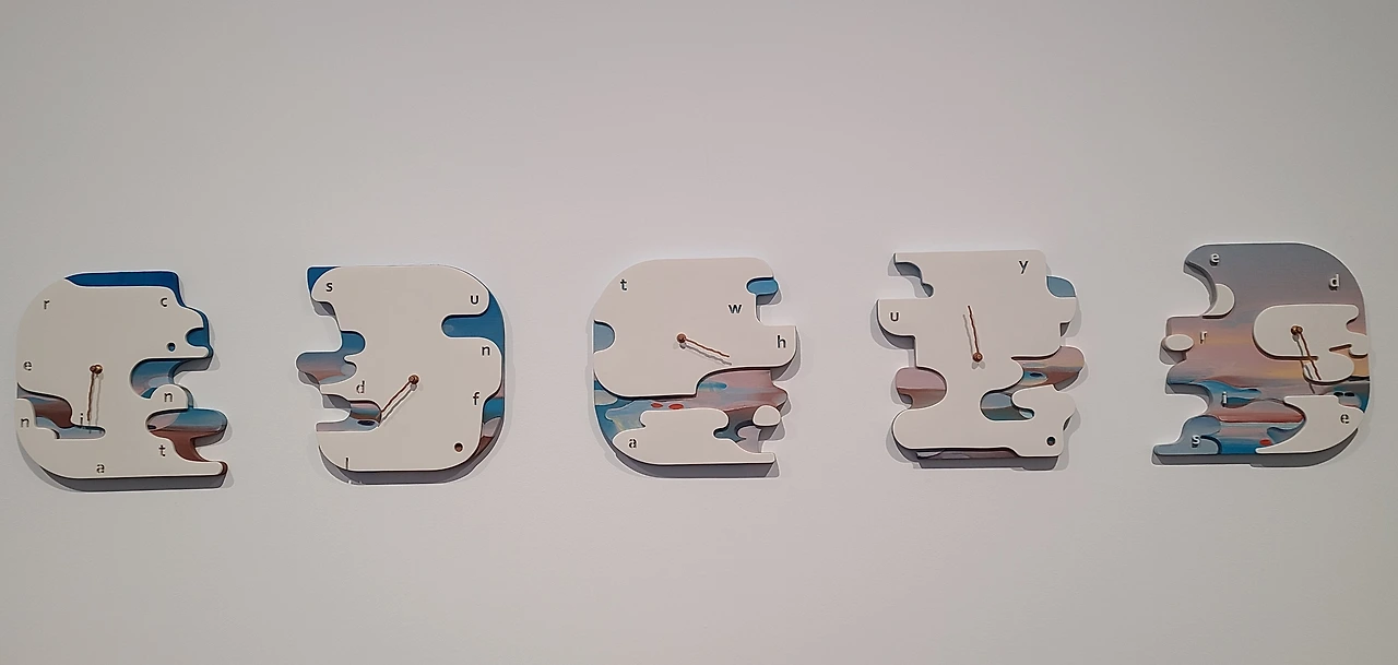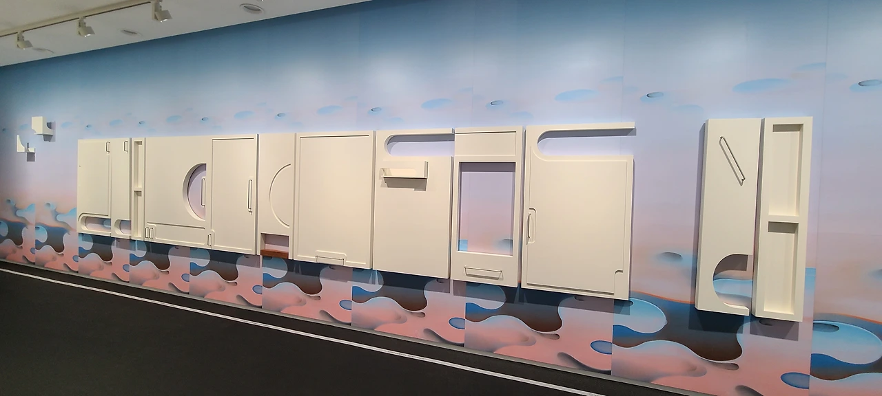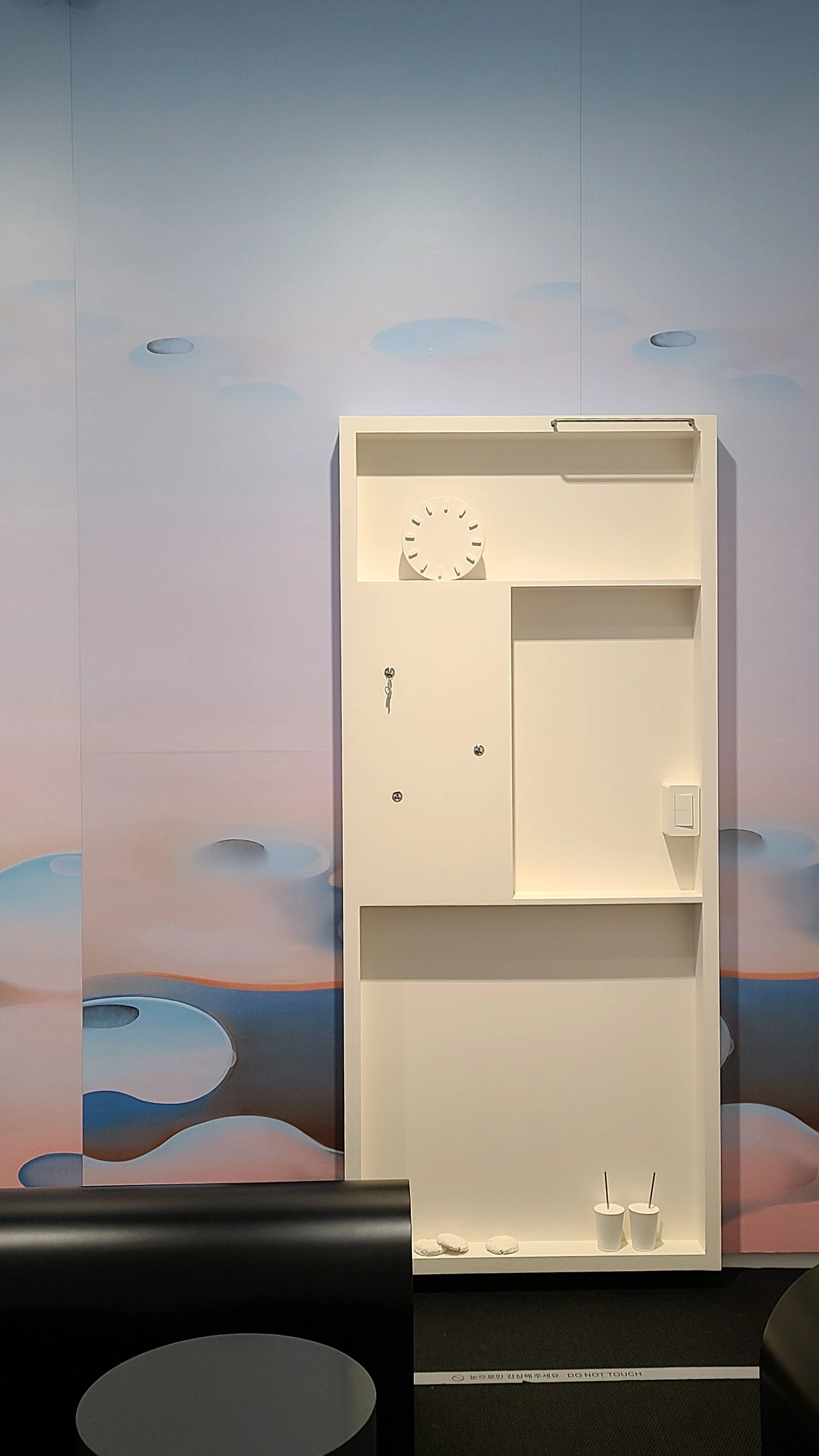 새벽노을 같은 하늘색과 분홍색 벽면으로 둘러싸인 이 전시 공간에는 마치 수많은 문과 창문 그리고 선반 같은 것들이 걸려있어 더욱 비현실적인 공간처럼 보이도록 하고 있습니다. 특히 문처럼 생긴 작품들은 손잡이를 잡아당기면 미지의 공간이 나올 것만 같아 벽을 가득 채운 몽환적인 분위기에 비현실감을 더합니다. 이번 전시에서 가장 눈에 띄는 요소는 '문'일 겁니다. 공간을 넘어갈 때 사용하는 문들은 그 너머에 한정된 공간을 가지고 있기도 하고, 더 넓은 공간으로 펼쳐지기도 합니다. 그리고 잠기기도 하는 문은 공간 속에 있는 수많은 물건들을 보관하거나 가두기도 합니다. <시간들의 서랍>이 진행되는 아담한 전시장에 수많은 문들은 전시장의 안에서 밖을 나눔과 동시에 작가의 작품에서도 안과 밖을 나누어 줍니다. 작품을 관람하는 관객들은 전시장의 안이자 동시에 작품의 안에 머물며 작가가 상상하는 밖의 세계를 생각해보게 합니다.