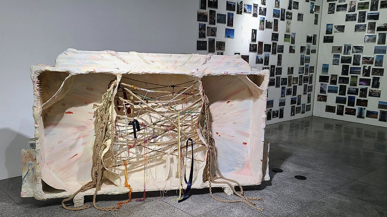 허수연 작가는 예술가의 쓰레기 하면 가장 먼저 떠올릴 수 있는 종이로 만들어진 종이죽과 버려지는 소재들을 선택해 전달하고 있습니다. 회화의 가장 기반이 되는 재료라고 할 수 있는 '종이'는 그 자체로써도 많은 의미를 가지지만 쓰레기로 변모한 종이도 현대사회에서는 많은 의미를 가지고 있습니다. 특히 재활용의 대표주자이자 최근에는 플라스틱의 대체품으로써 떠오르지만 이것이 진정한 친환경인가 하는 논란을 불러일으키는 소재로 사용되고 있습니다. 작은 메모지부터 휴지, 종이빨대까지 우리의 삶에 너무나도 밀접하게 붙어있지만 무의식적으로 사용해 왔던 종이들은 우리의 눈에 잘 띄는 거대한 작품의 덩어리로 재탄생하게 되었습니다. 생활 속에 녹아 있었지만 폐기돼버린 작은 삶의 흔적들은 허수연 작가의 손을 거쳐 캔버스에 박제되어 우리에게 새로운 모습을 제시하고 있습니다.