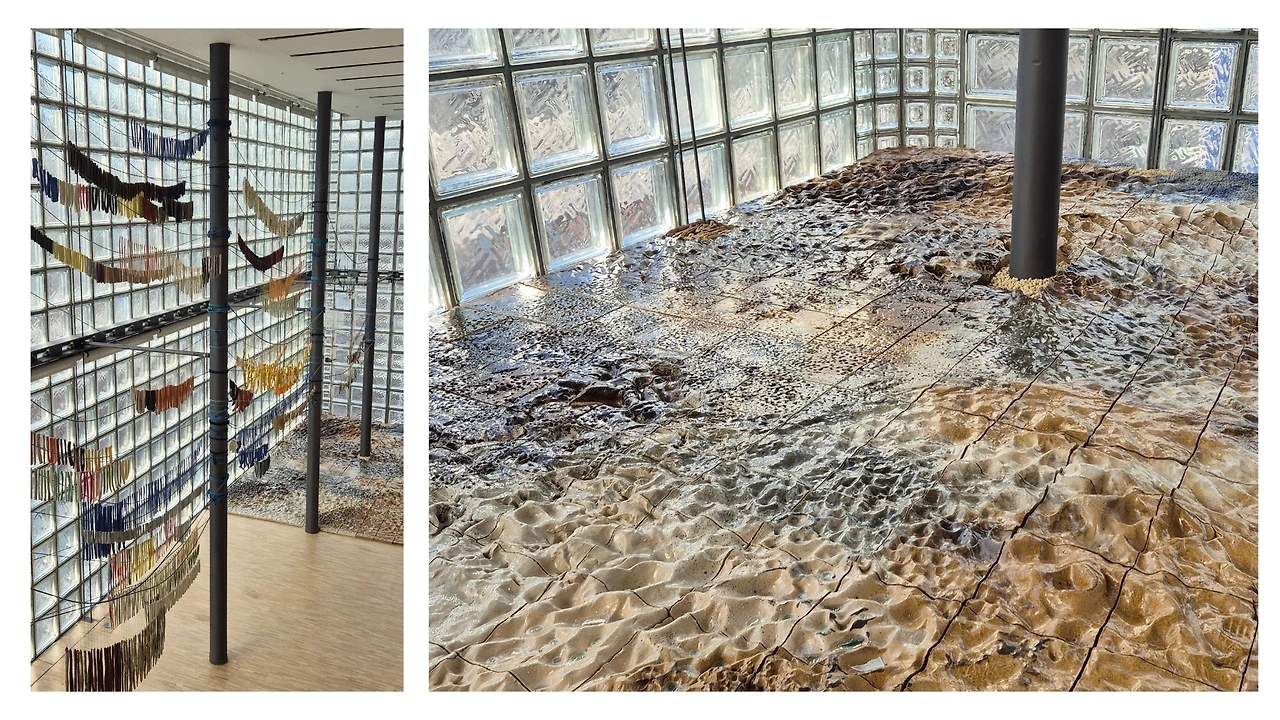전시장에 들어서면 가장 먼저 눈길을 사로잡는 것은 거대한 유리창 앞에 가득 매달려 있는 <Call us, call us(우리를 불러, 우리를 불러)>(2023-2024)이다. 텍사스에 위치한 자신의 집에서 도자기로 제작한 1,000개 이상의 풍경은 바람 한 점 불지 않는 전시장에 거대한 공기의 흐름을 만들어 내는 듯하다. 그리고 바로 그 아래 바닥에 깔린 거대한 작품은 <always, always, always(언제나, 언제나, 언제나)>(2023-2024)이다. 바닥을 가로질러 펼쳐진 대형 도자기 작품은 지난 가을 뉴비가 일본에 도착한 후 후지와라 토기공방(Fujiwara Earthen Art Studio)과 협력하여 도치기현 마시코에서 만들어졌다. 300개 이상의 두꺼운 세라믹 슬래브로 이루어진 이 작품은 점토위에서 여러 개의 유리, 생점토 분말, 도쿄에서 찾은 유리와 여러 재료를 사용해 제작되었다. 뉴비는 이 재료들 위에서 몸을 자유롭게 움직이며 형태를 만들었다. 손가락, 팔꿈치, 발 등 다양한 신체부위를 움직이며 만들어낸 흔적들은 마지 강이나 산맥 같은 자연 풍경같기도 하고 망망대해의 반짝이는 표면처럼 보이기도 한다. <Call us, call us>와 <always, always, always>는 햇빛이 가득 들어오는 거대한 창문 옆에서 흙을 통해 자연, 환경과 소통한다. 뉴비는 대지의 일부인 흙을 인간의 손길로 변화시킨다. 작가에 의해 자연물에서 인공물이 된 흙은 자신을 둘러싼 환경을 통해 다시 자연의 흔적을 가득담고 본래 자신이 있던 곳과 가까운 지점으로 되돌아 간다. 천장부터 바닥까지 그 흔적들로 가득 차 있는 공간은 본래 유리 너머에서 보일 풍경을 관람객 바로 코앞으로 끌어온 듯하다.