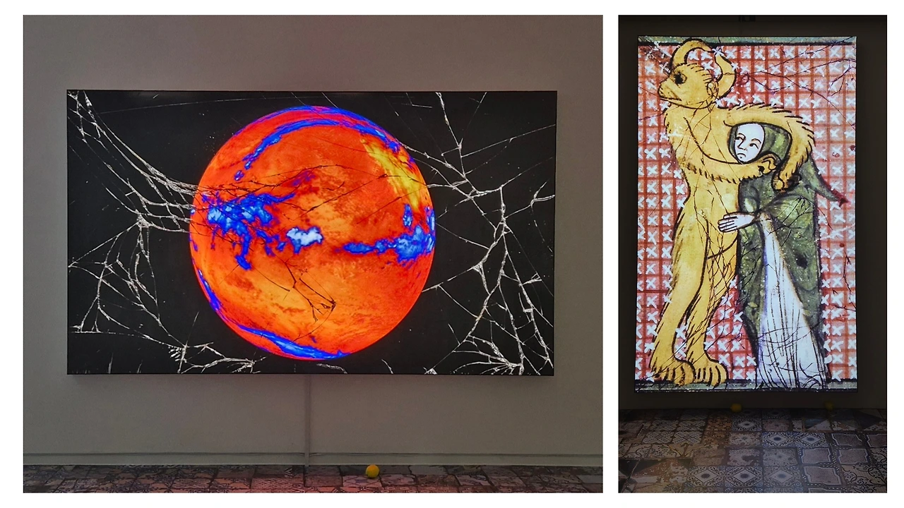 전시장 입구부터 곳곳에 설치된 라이트 박스 작품 시리즈는 우리에게 친숙한 TV, 스마트폰과 같은 영상매체 기기를 연상시킨다. 퐁텐은 금이 간 화면 위에 서로 연관성 없고 인터넷에서 퍼온 이미지를 복제하고 확대하여 보여주고 있다. 입구에서 바로 마주할 수 있는 작품 "무제-보호(Untitled (Protector), Untitled(Protection))"(2018)는 베일을 쓴 여성이 소의 얼굴을 가진 악마의 품에 안겨 있는 모습을 보여주고 있다. 어딘가 불안해 보이는 여성을 꼭 안고 있는 악마는 그녀를 지키고자 주변을 둘러보는 듯한 모습을 보여주고 있다.