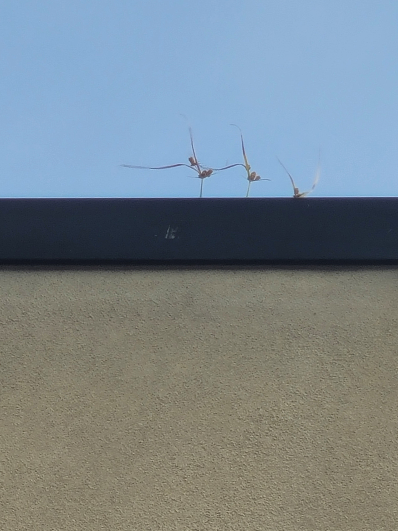 그런데 뜬금없이 금방동사니가 하늘에서 피어나 살랑거린다. 우리 집 지붕에 세 쌍둥이처럼 나란히 하늘거리고 있는 것이다.