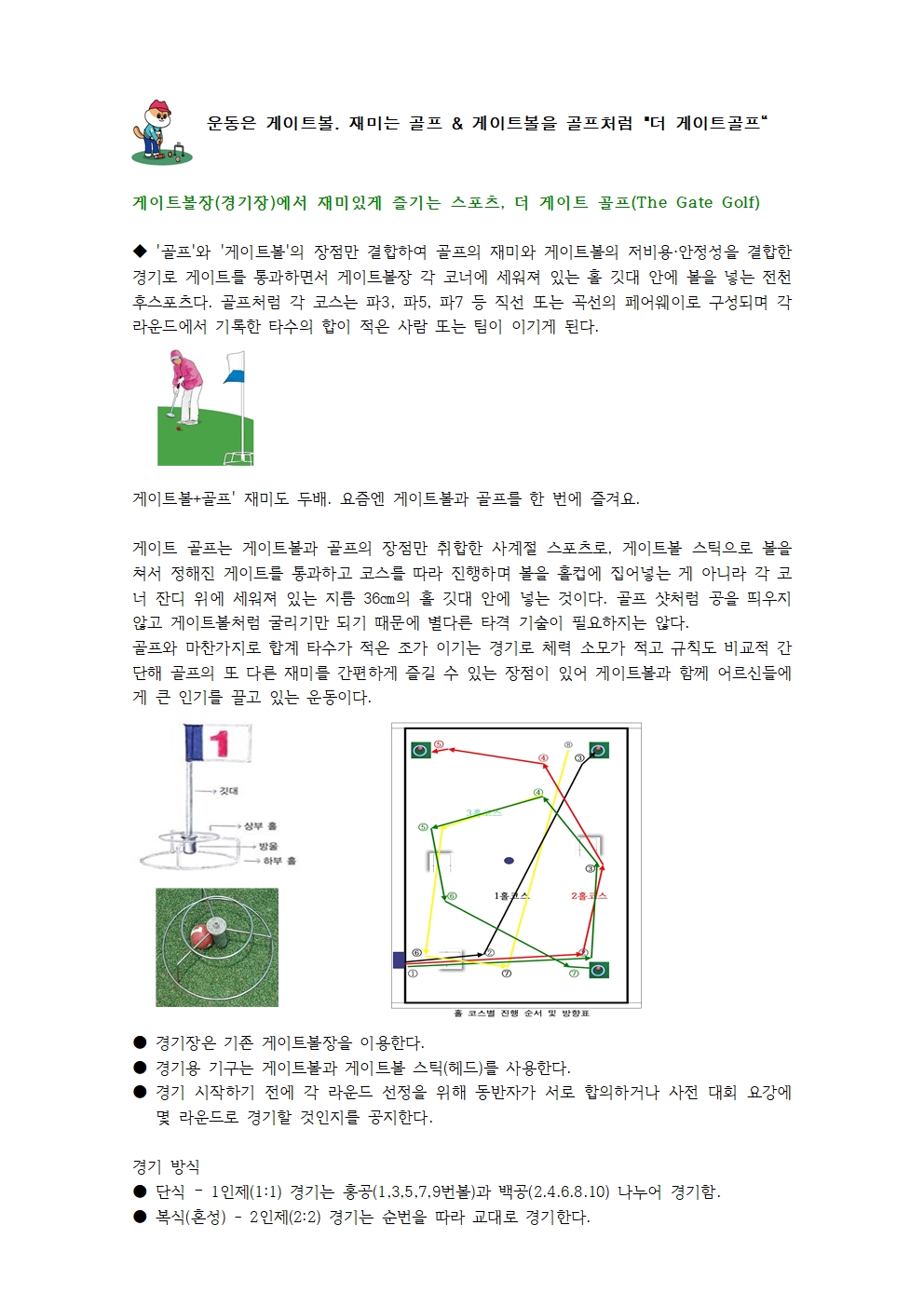 게이트+골프' 재미도 두 배. 요즘엔 게이트볼과 골프를 한 번에 즐기는 스포츠로 장애인과 비장애인, 고령자 등이 함께 운동하기가 안성맞춤인 운동이다. 특히 휠체어 이용 장애인이나 목발 이용 장애인도 운동할 수 있도록 필자가 개발하여 보급하고 있는 뉴 스포츠 종목이다.