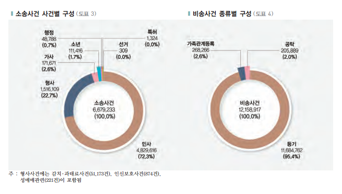 실제 우리나라 법원에 접수된 소송사건을 사건별로 살펴보면 민사사건이 72.3%, 형사사건이 22.7%로 전체 소송사건의 95%를 차지할 정도입니다.