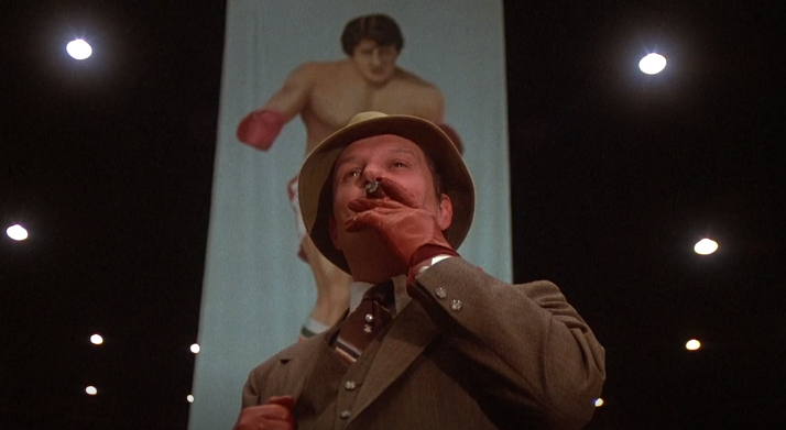 그리고 또 흥미롭게 볼 수 있는 파트가 프로모터와 록키의 구도입니다. 이 영화에서 록키는 경기가 시작하기 전까지 기자회견을 제외한 모든 장소에서 챔피언 아폴로 크리드를 만나지 못합니다. 그렇기에 록키에게 있어서는 아폴로 크리드를 대변하는 프로모터에게서 챔피언과 같은 위압감이 느껴졌을 것입니다. 그리고 이는 영화에서 화면의 구도를 통해 잘 묘사됩니다. 록키와 프로모터가 함께 강조되는 장면은 두 장면인데요. 이는 프로모터가 록키에게 경기를 제안하는 장면과 록키가 프로모터에게 포스터 관련 항의를 하는 장면입니다. 앞서 설명한 두 장면 모두 프로모터를 비추는 카메라는 아래에서 위를 향해 찍는 구도를 유지하고 있습니다. 이는 록키보다 해당 인물이 우위에 있는 인물임을 알려주는 장면이기도 하며, 챔피언 아폴로 크리드에 대한 록키의 압박감을 상징하는 장면이기도 합니다.