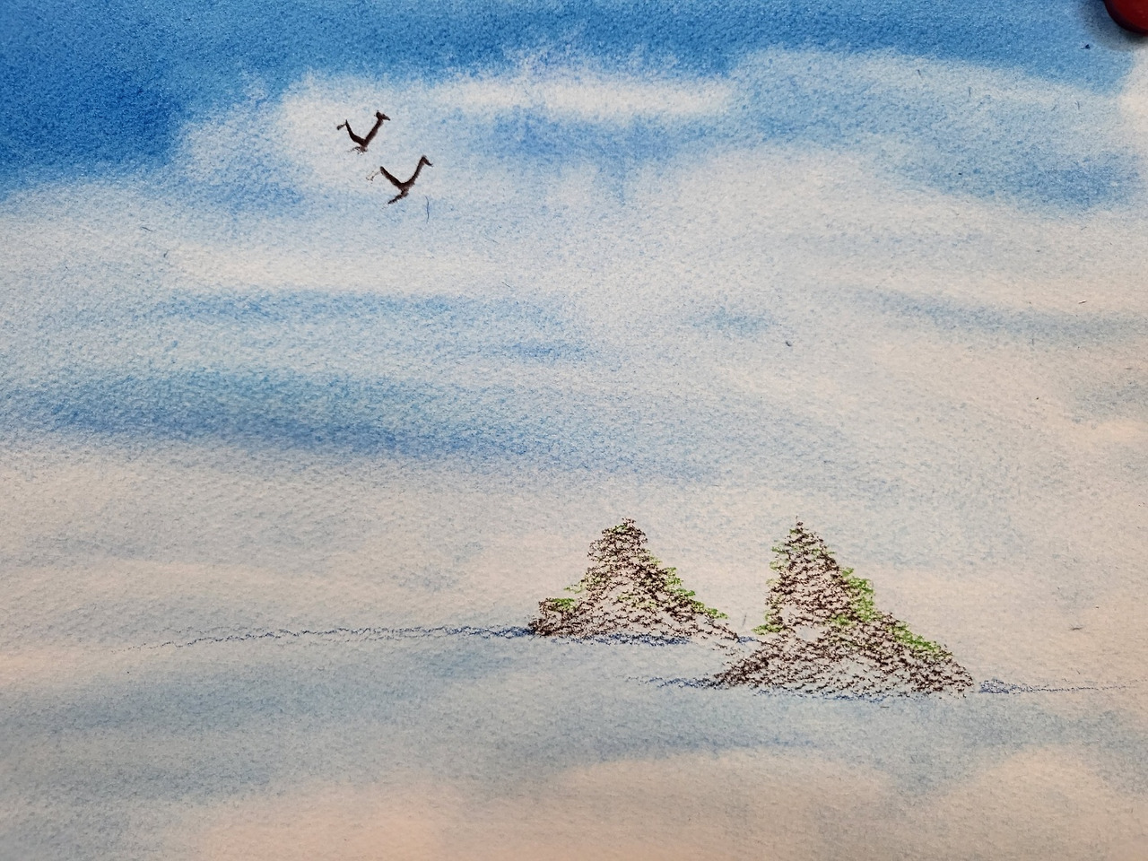 아침 일찍 출근하여 파랑, 갈색, 초록 색연필을 이용하여 아이들 작품마다 독도를 그려 놓았다. 파랑으로 그려 놓아 진 그림들 느낌이 다 달라 어디에 독도를 배치를 할지, 갈매기는 어 디에 놓으면 좋은지 고민하며 20명의 아이 그림에다 독도를 그렸다.