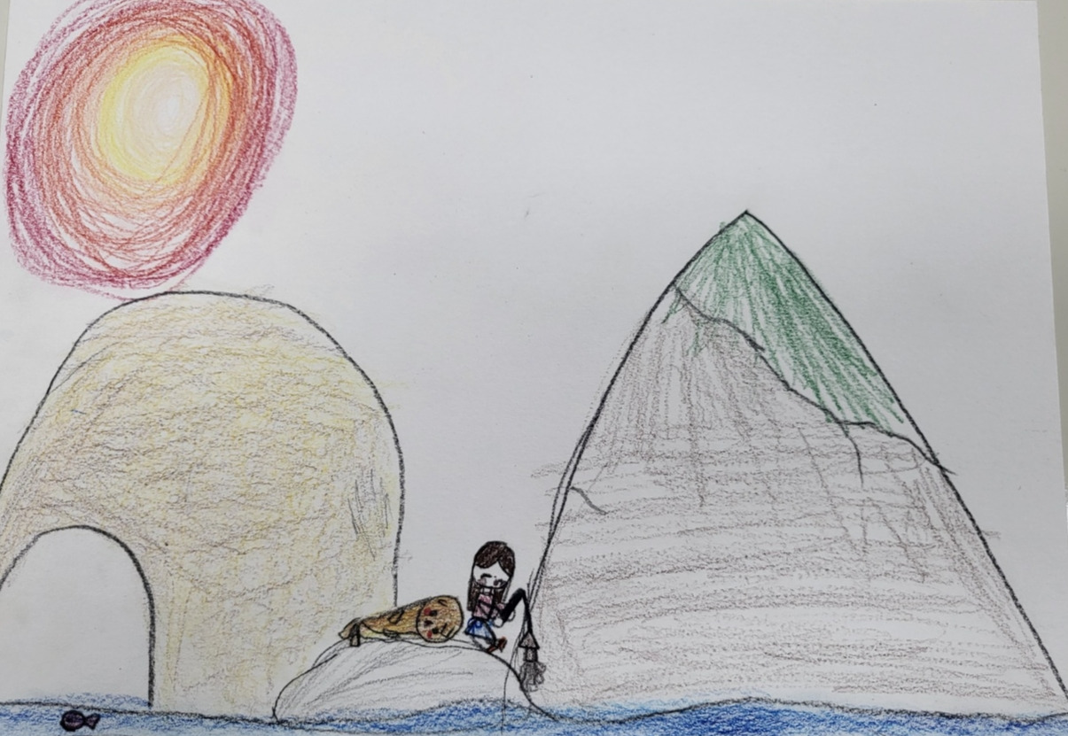 독도 수업은 아이들에게 너무 강렬했었다, 오늘 수학 공부로 네모, 세모, 동그라미를 이용하여 그림을 그리는 수업을 했는데 세모로 독도를 그렸다. 네모와 동그라미로 해와 물고기도 그렸다. 3일 내내 독도 이야기뿐이다.