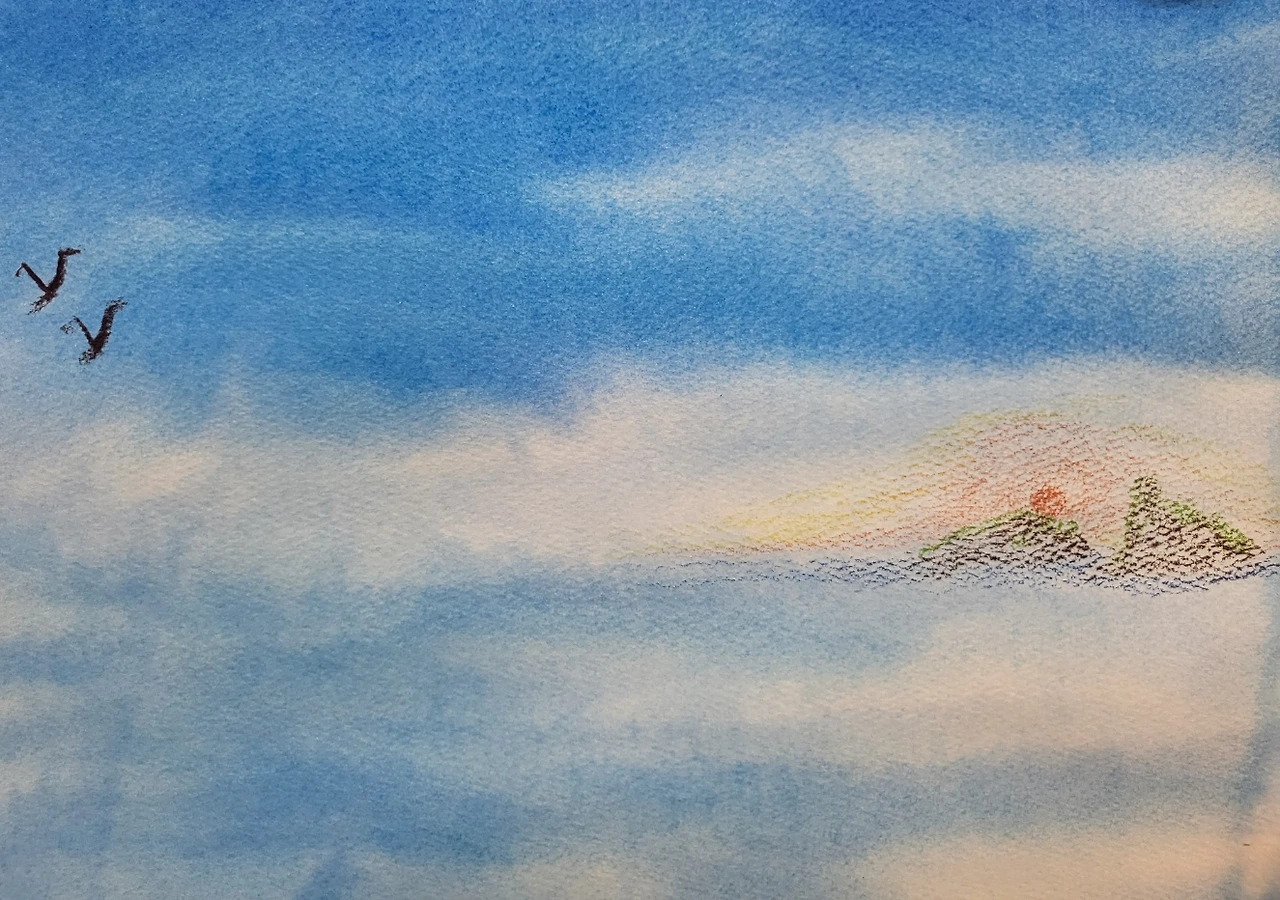 저번 주 금요일 예술 시간, 파란색을 이용한 습식수채화 그림을 그려 작품판에 붙여 놓았다. 작품을 감상한 아이들은 하늘 같기도 하고 바다같기도 한다고 이야기한다. 파랑은 몽환적인 느낌이 나기도 하는 색이다. 이 파랑에 조그마한 섬 두 개를 그려 놓았다. 아이들은 독도 라며 금방 알아차리고 호기심 있게 바라본다. 독도는 이렇게 푸른 바다에 바람과 파도와 지내며 씩씩하게 홀로 서 있다고 했더니 아이들은 내가 그린 수채화에다가 독도를 그려 달란다.