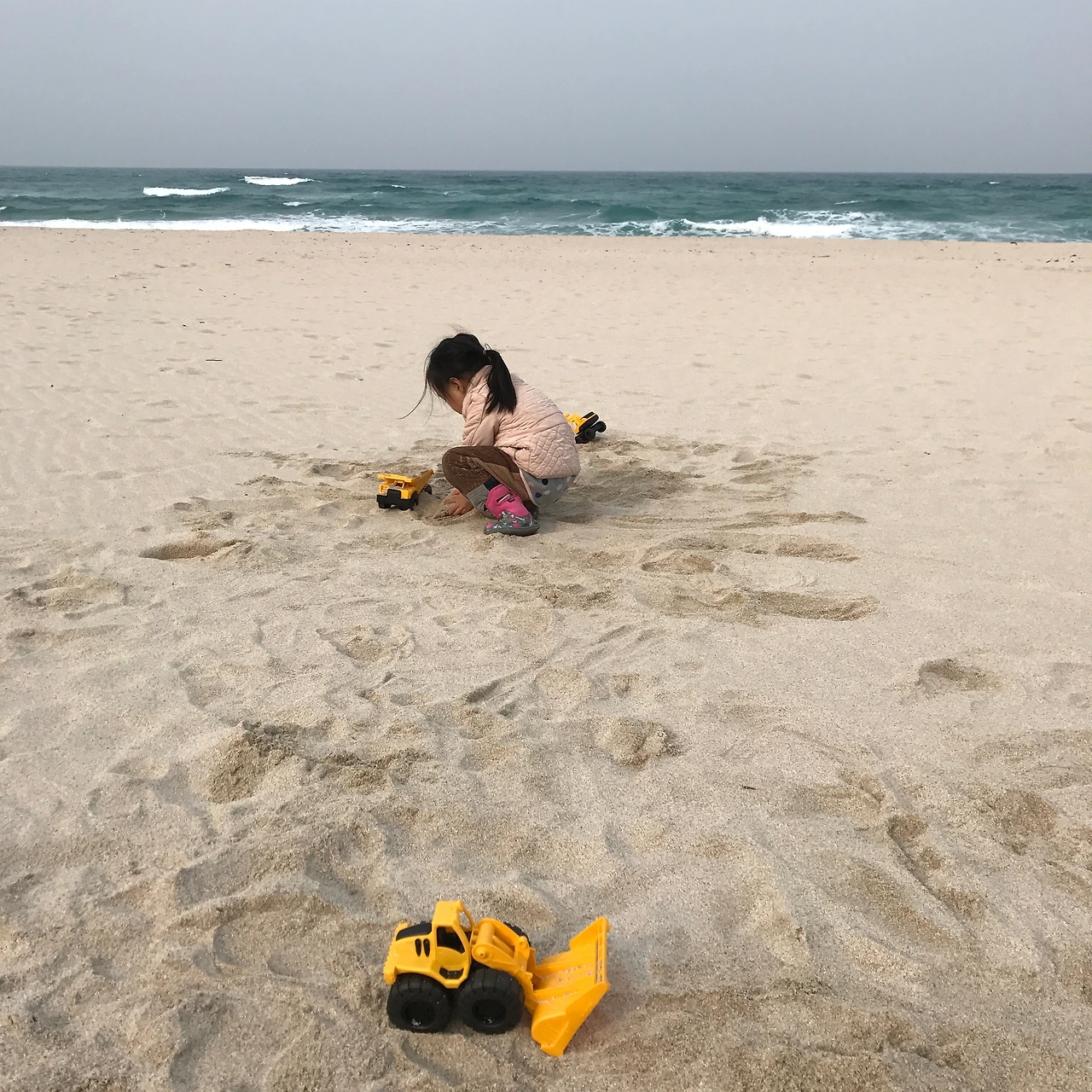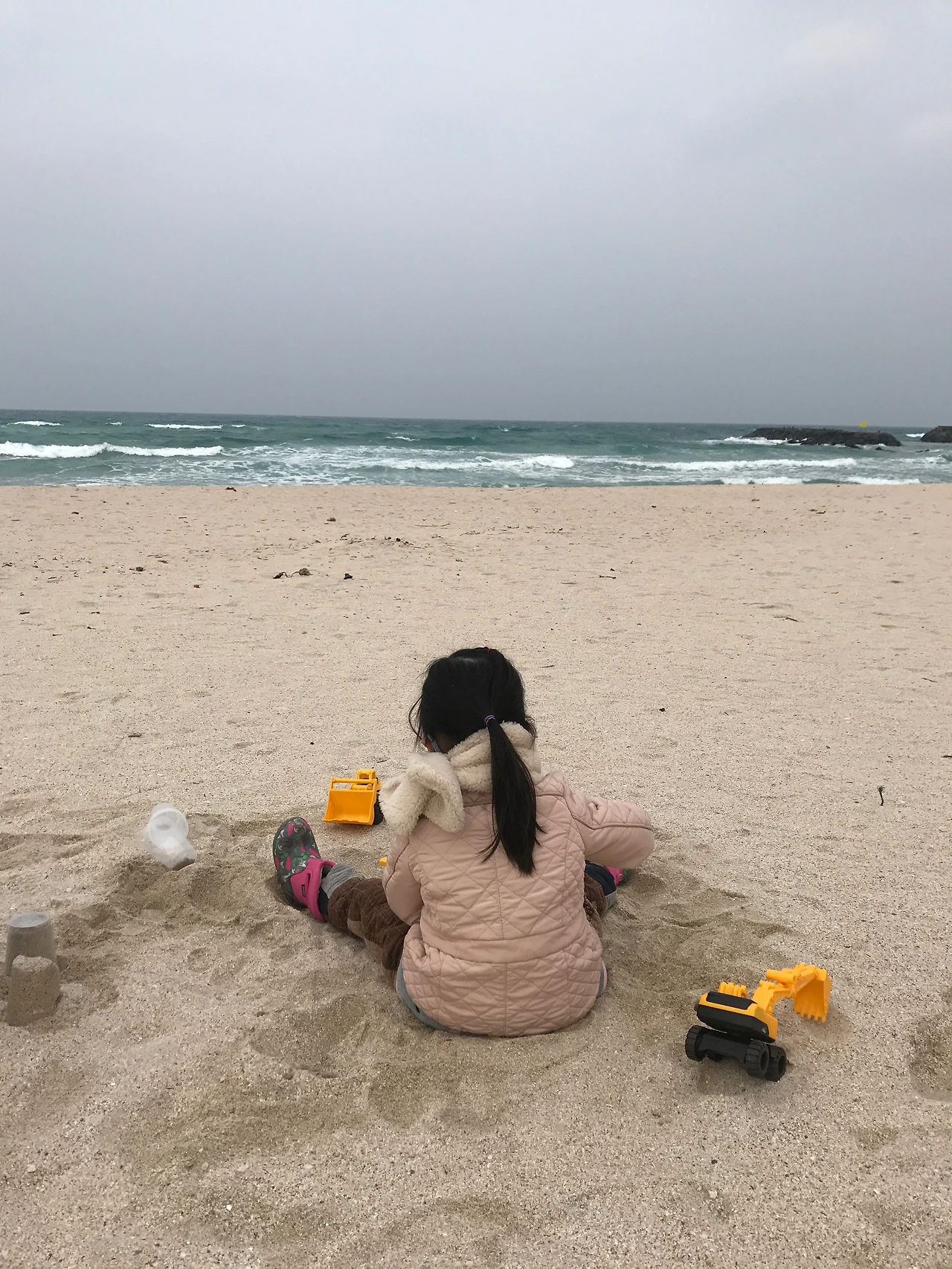 레이지마마에 도착한 첫날부터 곽지과물해변으로 향했다. 전날 출발한 차는 기상악화로 우리보다 한시간 정도 늦게 도착했다. 비가 온 뒤여서 춥고 강풍이 불어 모래가 심하게 날리는데도 장난감 가방을 꺼내 바다로 달려갔다. 비가 오나, 눈이 오나, 바람이 부나 우린 매일 모래놀이를 나갔다. 바로 앞 곽지로 갈 때엔 큰 모래놀이 가방을 들고 걸어 다녔고, 조금 떨어진 곳을 갈 땐 차에 실어 이동했다. 이왕 제주도에 왔으니 다양한 걸 해보고 싶었지만 4살은 달랐다. 좋아하는 하나의 놀이를 집중해서 꾸준히 하는 걸 좋아한다. 부모는 아이가 '또 해줘'라고 무한 반복시킬 때 '이 아이가 행복하구나'라는 걸 알고 있으니까.