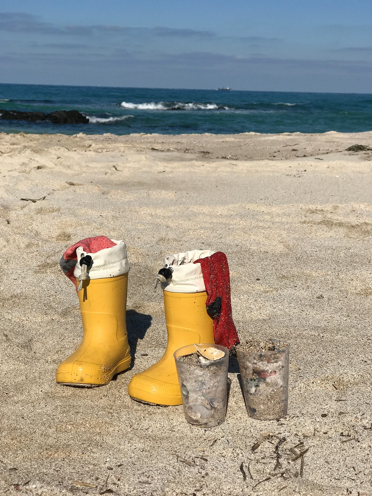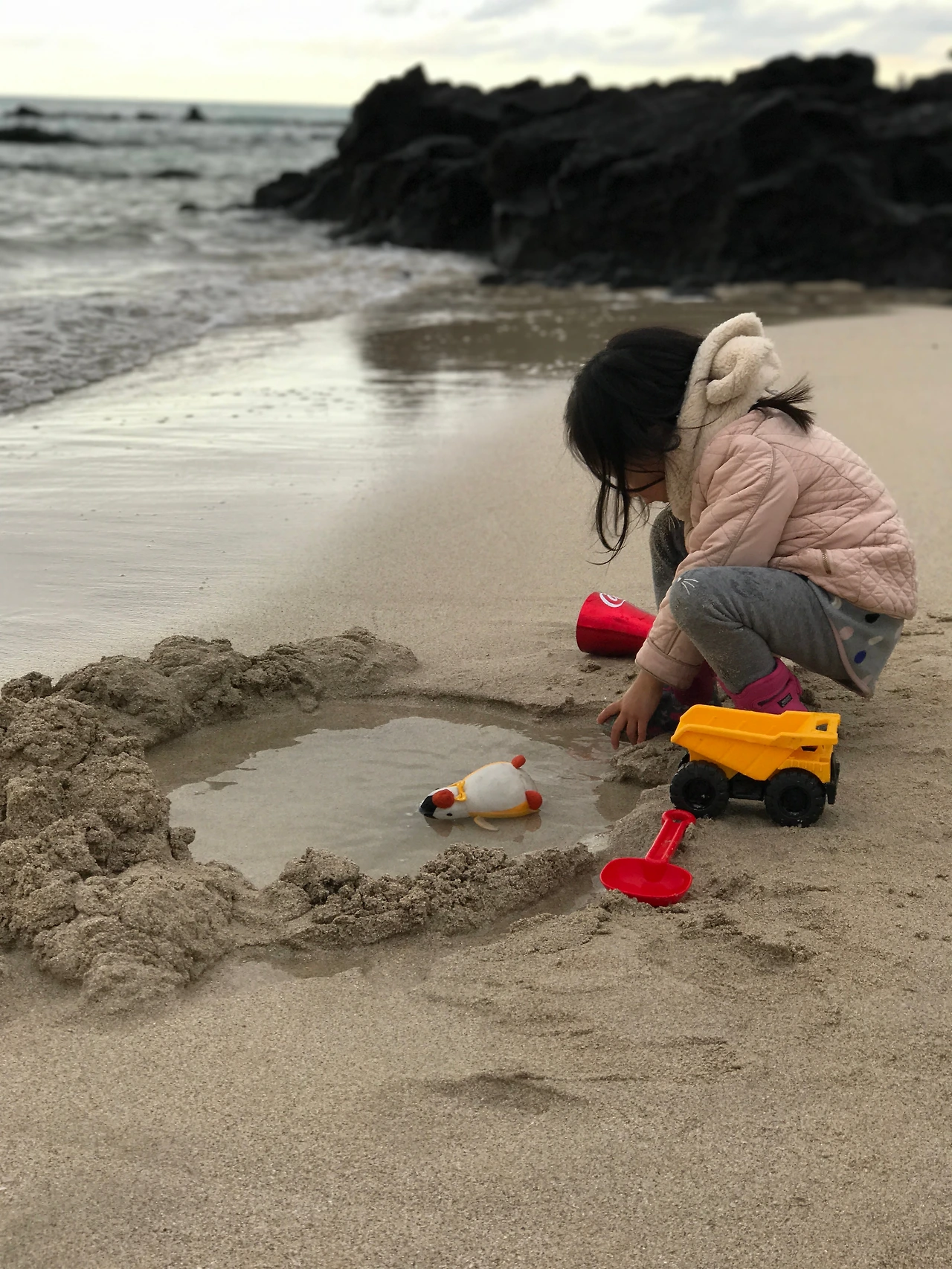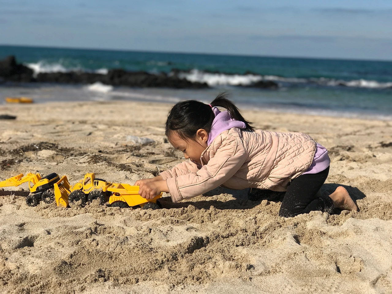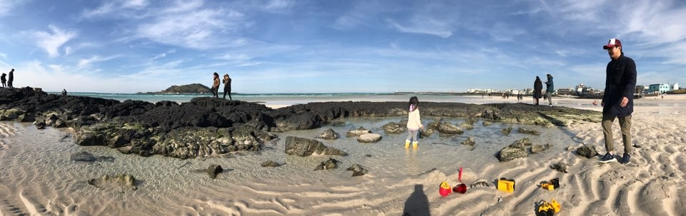 매일 하는 모래놀이에도 변화가 있다. 어디 바닷가이냐도 중요하지만 어떻게 노느냐도 중요하다 모래놀이 장난감으로 놀거나, 중장비차와 트럭으로 공사 역할극을 하거나, 바다가 준 선물들인 소라게, 거북손, 보말, 조개껍데기, 그리고 미역줄기들을 활용하면 소꿉놀이가 된다. 겨울이어도 선글라스는 필수고, 날씨 상관없이 놀려면 우비, 장화도 필요하다. 겨울이 모래놀이하기 나쁜 날씨는 아니다. 풍랑주의보가 내려 장난감들이 모두 날라가는 날도 있지만, 봄날처럼 따뜻해서 맨발로 모래 위를 거닐고 용천수가 퐁퐁 올라는 곳도 들어갈 수 있다.