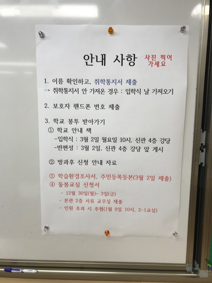 예비소집일에 대한 소문 중의 하나는 '1분 만에 끝난다'는 것. 정식 오리엔테이션은 아니지만 그래도 뭔가 오피셜한 무언가가 있겠지 하며 기대했다. 초등학교 안을 미리 구경할 수 있다는 것도 기대 거리 중의 하나였다. 꽁이와 나는 취학통지서 내에 적혀 있는 1-1반, 1-2반 교실을 찾아 3층으로 올라갔다. 그중 우리가 사는 OO아파트가 적힌 1-1반 교실에서 선생님께 취학통지서를 내니 명단에서 아이 이름을 찾아 그 옆에 보호자인 나의 이름과 연락처를 기재하셨다. 그리고 서류 봉투 하나를 건네주시며 칠판에 적혀 있는 공지사항을 사진 찍어 가라고 하셨다. 그게 끝이었다. 정말 1분 정도 소요되었을까...