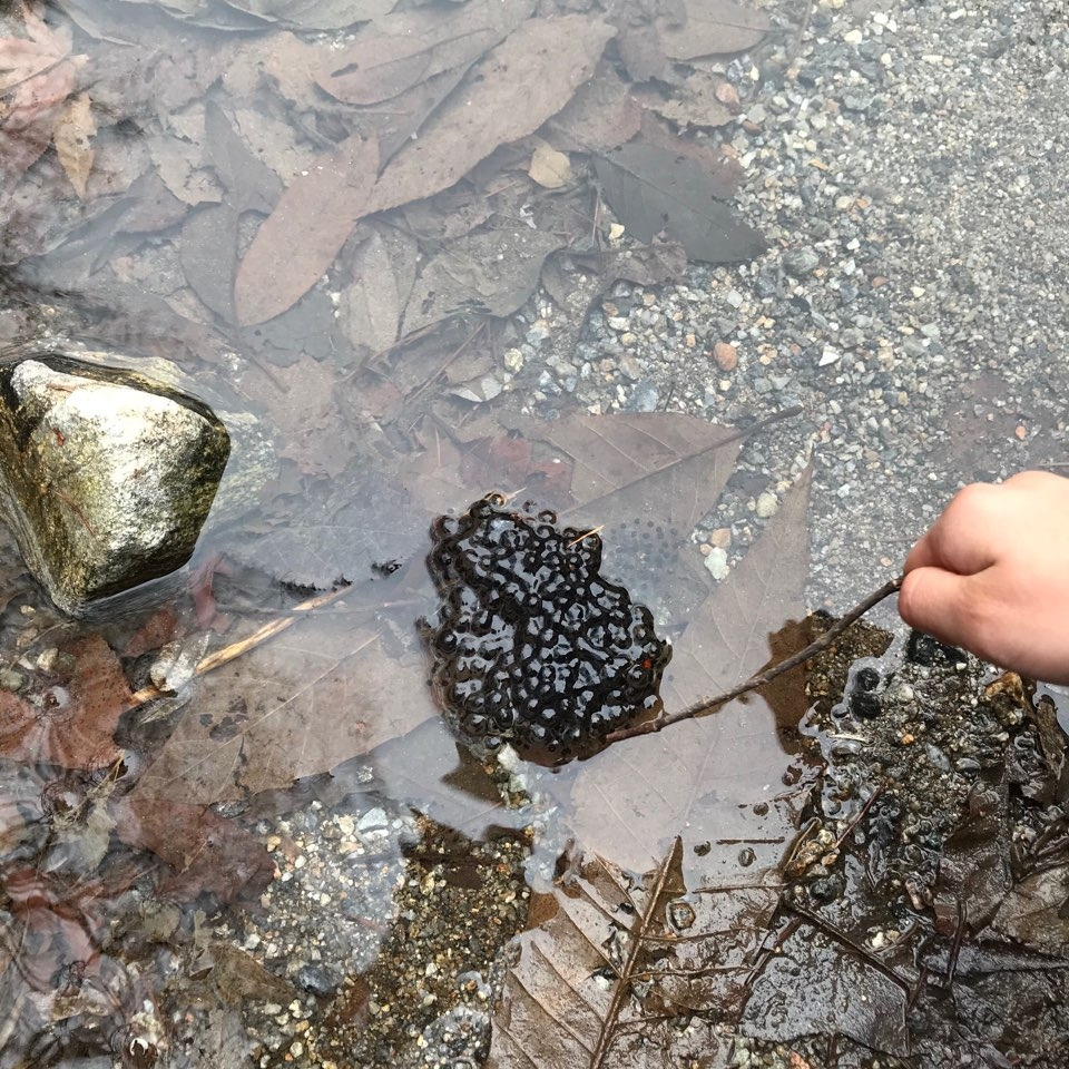 봄 계곡의 시원한 물소리를 들으며 산책하던 중 까만 개구리 알을 발견했다. 개구리 알 주변 바위 밑에서 개구리가 헤엄쳐 나오는 걸 꽁이가 보고 소리쳤다. "엄마, 여기 개구리!" 소리를 듣고 놀랐는지 개구리가 바위 밑으로 숨으려 하고 있었다. 생각보다 큰 개구리였다. 숨죽이며 다시 나오길 기다렸는데 내가 다른 곳에 가면 나왔다가 내가 가면 다시 사라졌다.