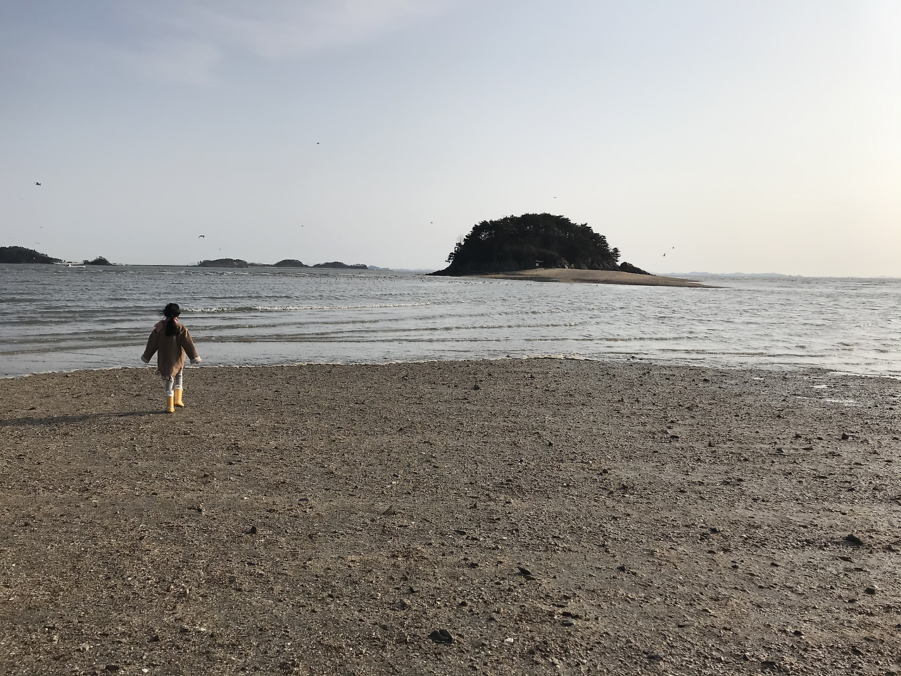 오전에 도시락과 모래놀이 장난감, 장화를 준비한 뒤 점심때쯤 선재도 목섬 바닷길에 도착했다. 생각보다 많은 아이들이 답답한 마음을 해소하러 나와있었다. 꽁이는 놀아본 대로 장화로 갈아 신은 뒤 조개와 소라게 등을 잡기 위해 삽과 물통을 들고 바닷길 갯벌로 향해 씩씩하게 걸어갔다. 조개들의 숨구멍 같은 곳을 열심히 파더니 작은 게 두 마리를 발견했다. 보드라운 갯벌이 아니어서 조개를 캐긴 쉽지 않았다. 대신 바다 고동과 예쁜 조개와 소라 껍데기를 잔뜩 모아서 통에 담았다. 한참을 놀다가 나와서 도시락을 먹고 예쁜 벽화가 가득한 선재리 어촌마을을 자전거 타며 구경했다. 누군가에겐 생활터전인 곳을 누군가는 사진을 찍으며 구경한다는 것이 미안해지는 발걸음이었다. 4시쯤 다시 바닷길로 돌아가 목섬으로 가는 길이 파도에 잠기는 걸 지켜봤다. 참으로 신기한 광경이었다.