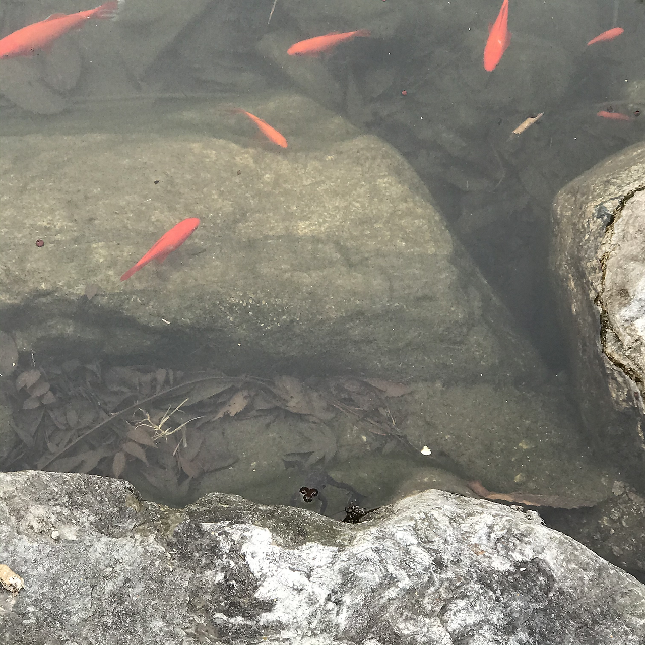 생태연못의 물고기들을 보러 갔다. 이곳엔 비단잉어와 함께 자라가 산다. 소금쟁이 몇 마리가 연못 위를 걸어가고 있었다. 물고기들 사이에서 개구리를 찾았다며 꽁이가 외쳤다. 진짜 물가에 개구리가 헤엄치고 있었다.