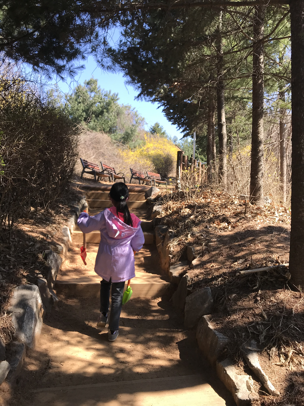 인근 숲 공원 내 비밀스러운 모래 놀이터에 가보기로 했다. 뭐하고 놀까 생각하다 모래 속에 보물을 숨겨서 찾는 놀이를 만들었다. 홈콕키트 안의 알록달록 퍼니콘을 모래 속에 숨긴 뒤 시간 안에 찾는 게임이다. 큰 모래 삽을 두 개 챙겨 공원 숲길을 한참 걸어갔다. 퍼니콘 보물 찾기는 12:6으로 꽁이가 이겼다. 운이 좋게 돌아오는 길 개나리가 활짝 핀 새로운 산책로를 발견했다.