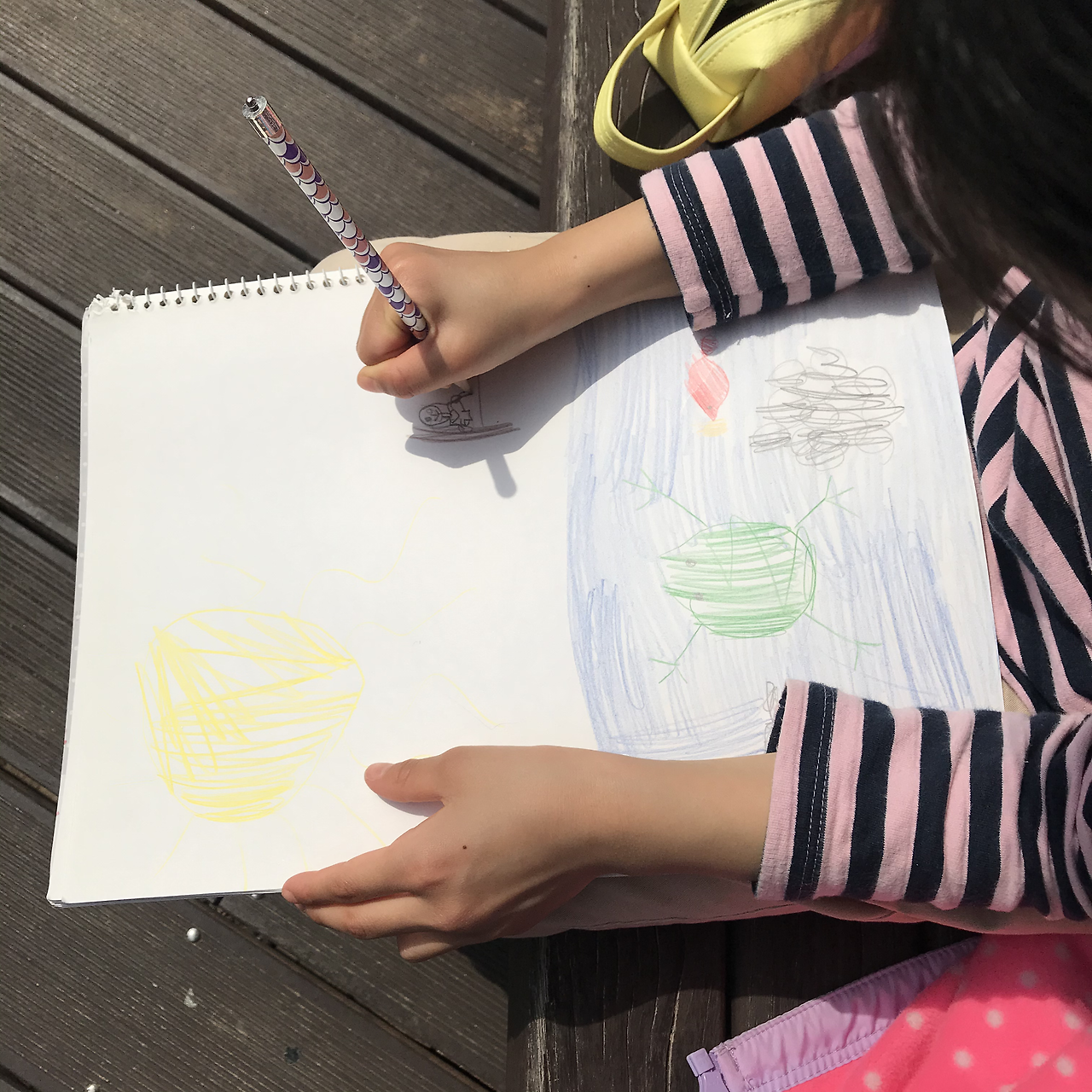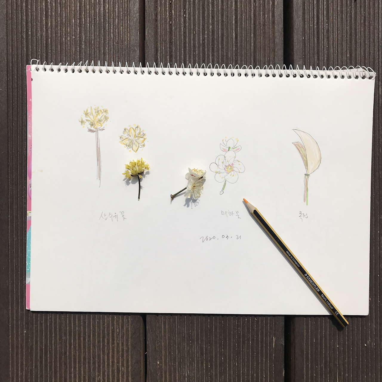 아이와 산책을 그냥 다니면 재미없으니 테마를 정해 보았다. 연못가에 갈 땐 '사생대회' 놀이를 위해 스케치북과 코팅지, 연필과 색연필을 챙겼다. 아파트 건너 생태연못엔 산수유꽃, 매화꽃, 목련꽃 외에도 민들레꽃, 이름 모를 꽃들이 가득했다. 엄마는 식물 세밀화를, 아이는 평소 사랑하는 연못을 그려본다. 꽃을 관찰하며 그리다 보니 매화꽃과 벚꽃의 차이가 확연하게 느껴진다. 이렇게 또 우린 배워간다. 엄마 눈엔 개구리가 안 보이는데 아이는 개구리가 있다며 가장 크게 그린다. 수련도 자라고 있으니 개구리 폴짝하는 모습도 곧 볼 수 있을 것 같다.