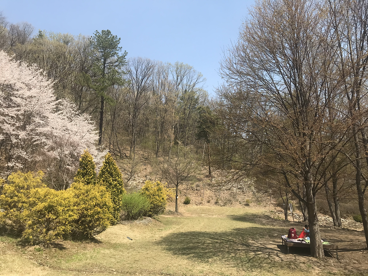 퇴촌의 식물원에서 가장 완벽한 피크닉 장소를 발견했다. 하트 모양의 나뭇잎이 돋아나고 있는 내 사랑 계수나무 아래, 황홀하게 아름다운 벚꽃나무 건너, 바로 옆으로 올챙이와 송사리들이 헤엄치고 있는 연못과 계곡이 있는 자리에 돗자리를 피고 소풍을 즐겼다. 올챙이를 데려가도 된다는 말에 꽁이는 올챙이를 엄청 잡았다. 딱 6마리만 키워보자고 하고 새 식구로 입양했다. 올해로 다섯 번째 도전인데 개구리가 될 때까지 잘 키워보자!