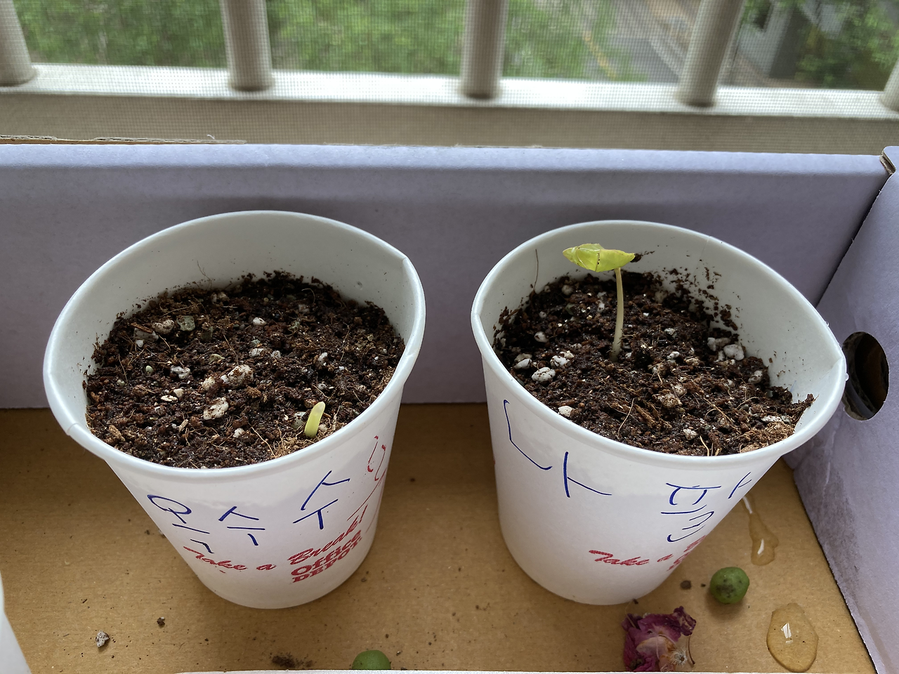 지난주 수요일 2차 학습 꾸러미로 받아온 6종의 씨앗을 심었다. 작은 화분에 배양토를 깔고 2~3개의 씨앗을 넣은 뒤 흙을 덮는다. 물을 흠뻑 준 뒤 해가 잘 드는 베란다 창가에 놔두며 며칠을 들락날락하며 지켜봤다. 강낭이(강낭콩 화분 이름)가 가장 먼저 싹을 틔우나 싶었는데 나팔꽃 > 옥수수 순으로 배양토 밖으로 머리를 밀어낸다. 꽁이는 봉숭아를, 나는 강낭콩을 1순위로 기다렸는데 의외의 결과였다. 흙, 햇볕, 물 이 세 가지에 세상에 나오려는 발아 에너지가 더해져 주말 동안 우리는 와! 하는 탄성을 질렀다.