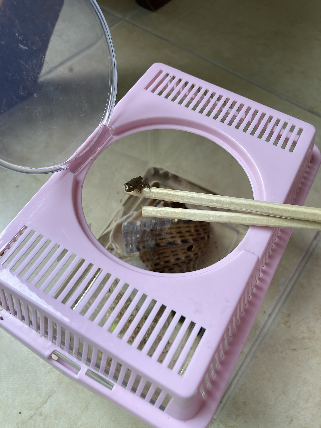 그런 여러 시도 끝에 올해는 금붕어 밥도 구입하고 갈아 줄 물도 미리 준비해서 잘 키워오고 있었다. 가장 성장이 빠른 올챙이가 어느덧 개구리가 되었는데 상륙 연습을 할 수 있도록 어항의 구조를 바꿔 줘야 한다는 걸 몰라 그만 아쉽게 이별하게 되었다. 이후 뒷다리, 앞다리가 나온 청소년 올챙이들을 따로 분리했고 큰 조개와 돌멩이를 넣어 개구리가 상륙 준비를 할 수 있도록 했다. 내 새끼손톱만 한 개구리를 보고 있자니... 이 개구리를 무서워한 내가 부끄러워진다. 다른 애들도 성체가 되면 근처 연못으로 방생하러 가야겠다.