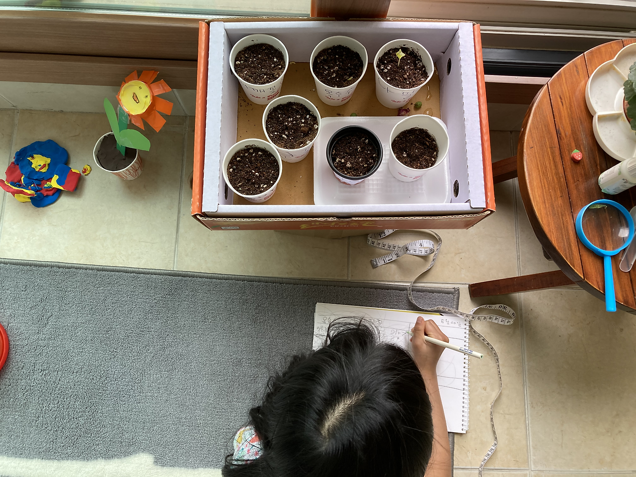 이런 순간을 사진 몇 장으로 남기기엔 너무 아쉬워 꽁이의 종합장을 꺼내 관찰일지를 작성해보기로 했다. 슥슥 선을 그어 6칸으로 나눈 뒤 씨앗의 이름들을 쓰고 심은 날짜를 기록했다. 싹이 돋은 날을 시작으로 매일 성장한 키, 생김새 등을 써보려고.