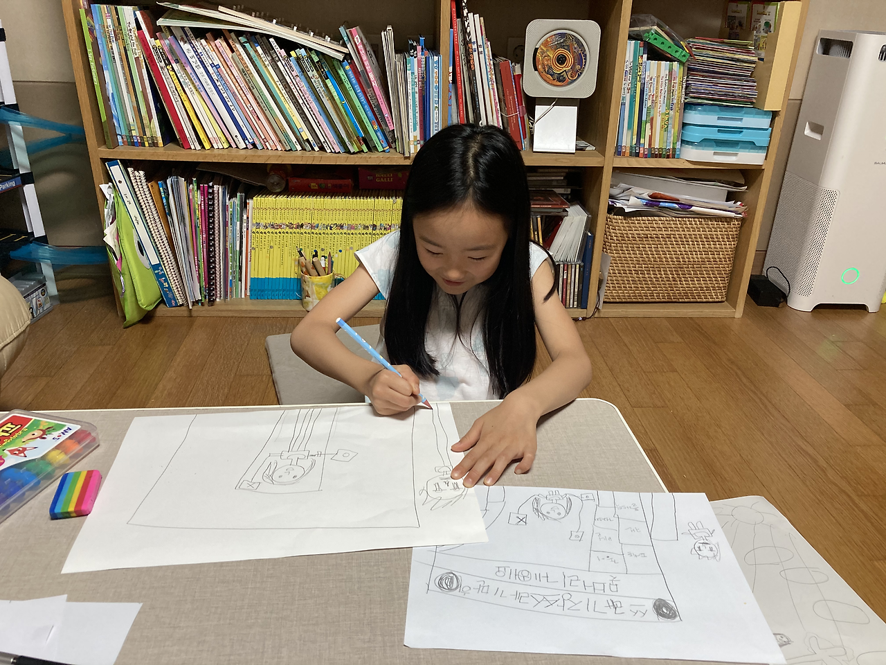 미니스톱에서 초등학생들 대상 그림 공모전을 하는데 주제가 ‘환경오염으로부터 우리 마을을 지키는 나만의 방법’이란다. 지난주 도서관에 갔다가 도화지를 받아왔다. 접수만 해도 아이스크림을 선물로 준다니 기쁘게 참여해 보겠단다. 아직 초1에겐 어려운 주제인 거 같아 각자 다른 종이에 밑그림을 그리고 서로 얘기를 나눠봤다. 꽁이가 그린 건 꽁이가 할 수 있는 방법이라고 그걸 그리겠다고 했다. 그래 ok.
