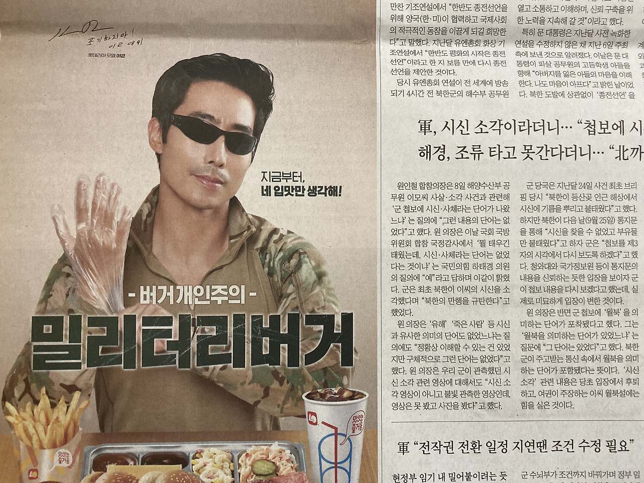 하지만 광고의 목적, 그 광고가 노리는 점을 올바르게 이해한다면 수많은 광고 홍수를 만드는 데 미디어가 있다는 걸 알게 된다. 얼마 전 조선일보에 롯데리아 군대리아 버거 광고가 게재되었다. 마침 아이가 다니는 학원 옆 롯데리아에도 큰 포스터가 붙어 있어 얘기를 나눠봤다.