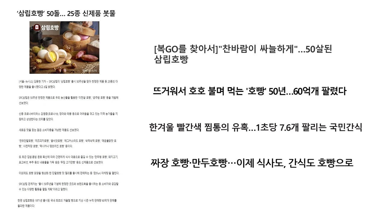 얼마전 신문을 보며 삼립호빵이 50주년을 맞아 신제품 25종을 출시했다는 기사를 봤다. 마침 슈퍼에서 호빵을 발견해 집에서 쪄먹으며 추가 기사를 찾아봤다. 아이는 "엥, 호빵 나이가 50살이야? 60억은 엄청 큰 숫자인데... 그래도 단팥이 젤 맛있어." 하며 읽더니, 가장 맘에 드는 헤드라인으로 <"찬바람이 싸늘하게"... 50살된 삼립호빵>을 골랐다. 그렇게 호빵에 대한 정보가 늘었다.