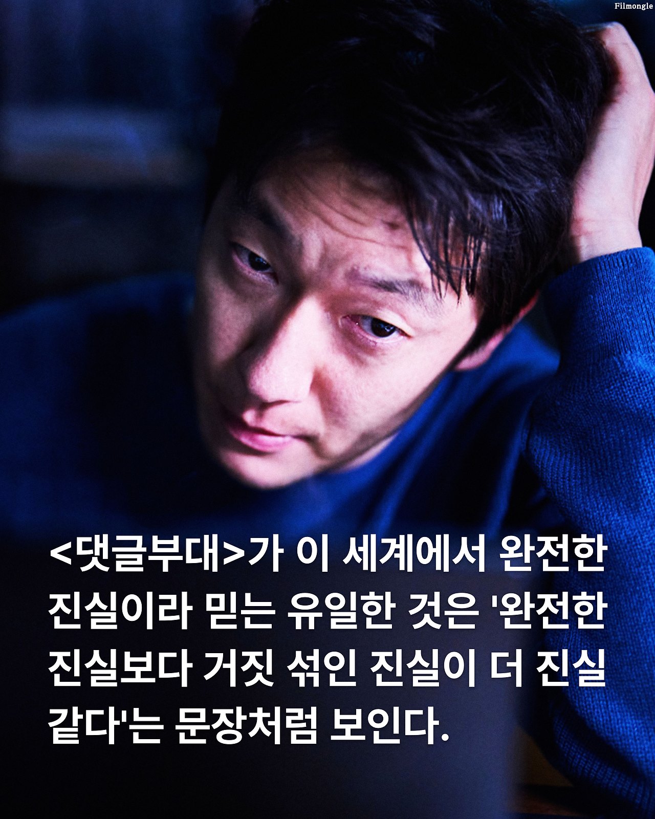 <댓글부대>가 이 세계에서 완전한 진실이라 믿는 유일한 것은 '완전한 진실보다 거짓 섞인 진실이 더 진실 같다'는 문장처럼 보인다.
