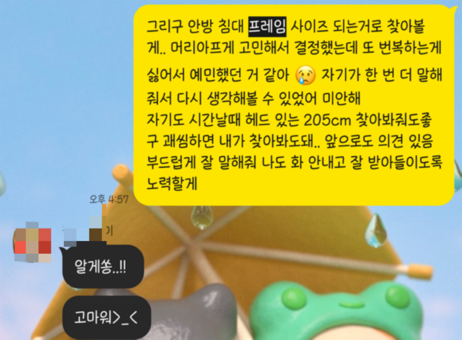 우리는 추가 논의 끝에 기존에 계약했던 침대 프레임을 헤드만 빼고 제작하기로 결정했다. 위약금도 내지 않고 맘에 쏙 드는 프레임도 포기하지 않아도 되는 최선의 해결책이었다. 우탄이가 분란만 될 것 같아 다시 한 번 얘기를 꺼내지 않았거나 남편의 말을 듣고도 내가 고집을 부렸다면 훨씬 더 일이 복잡해졌을 것이다.