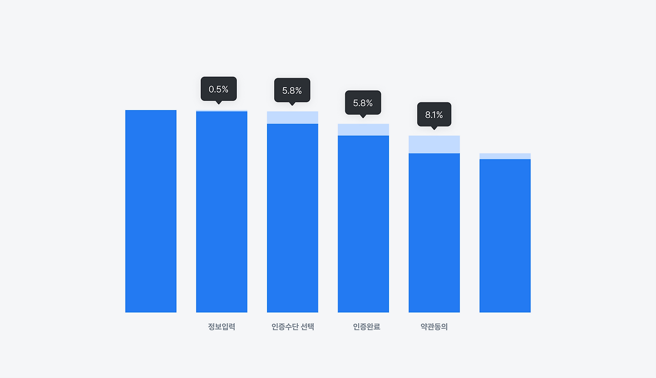 간편인증 퍼널도 자세히 분석해 봤어요. 이때, 모든 단계에서 전환율이 10% 내로 개선됐지만, 간편인증을 완료하는 마지막 퍼널에서 17% 이탈했고, 다시 한번 개선하기로 했어요.