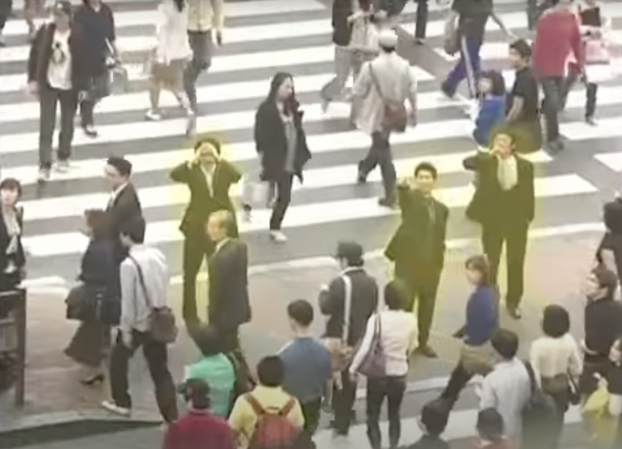 1명, 2명일 때에는 관심이 없던 사람들이 3명의 남자가 보니 지나가는 사람들 모두 같은 곳을 바라봐요.